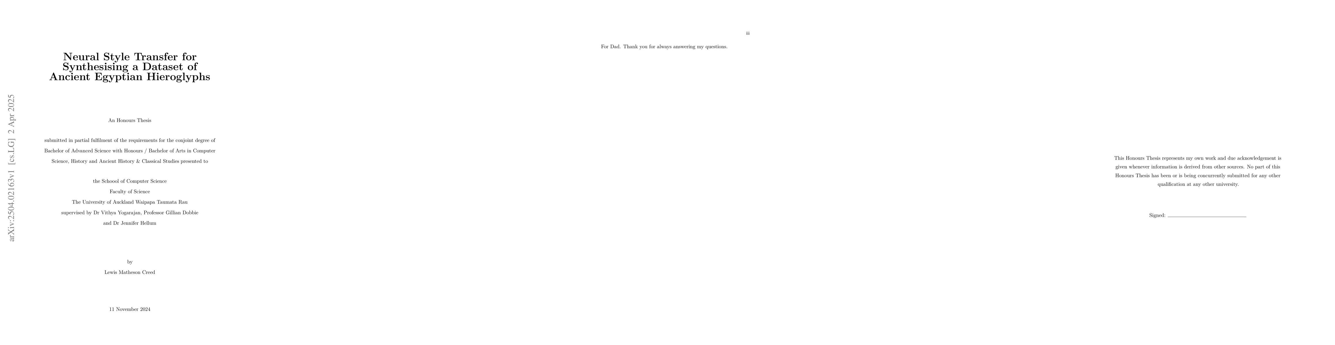 This work is novel in its application of Neural Style Transfer to generate synthetic datasets for a low-resource language like Ancient Egyptian, demonstrating its effectiveness in enhancing the quality and transferability of image data for classification models.