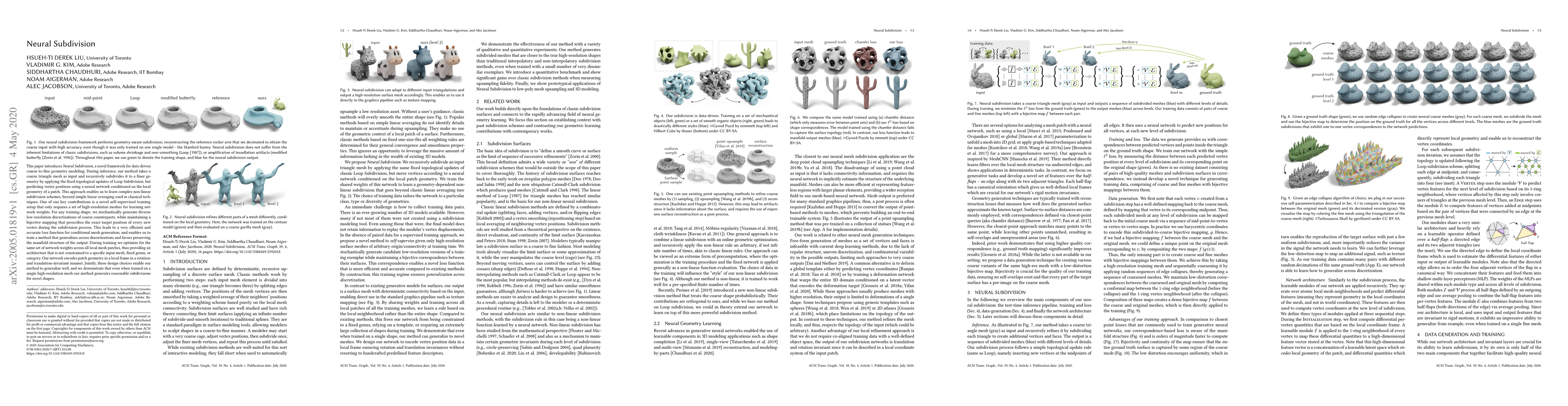 Neural Subdivision presents a data-driven framework for coarse-to-fine geometry modeling using a neural network to predict vertex positions during recursive subdivision. It employs a self-supervised training method that leverages high-resolution meshes to generalize across various shapes and maintain manifold structure.
