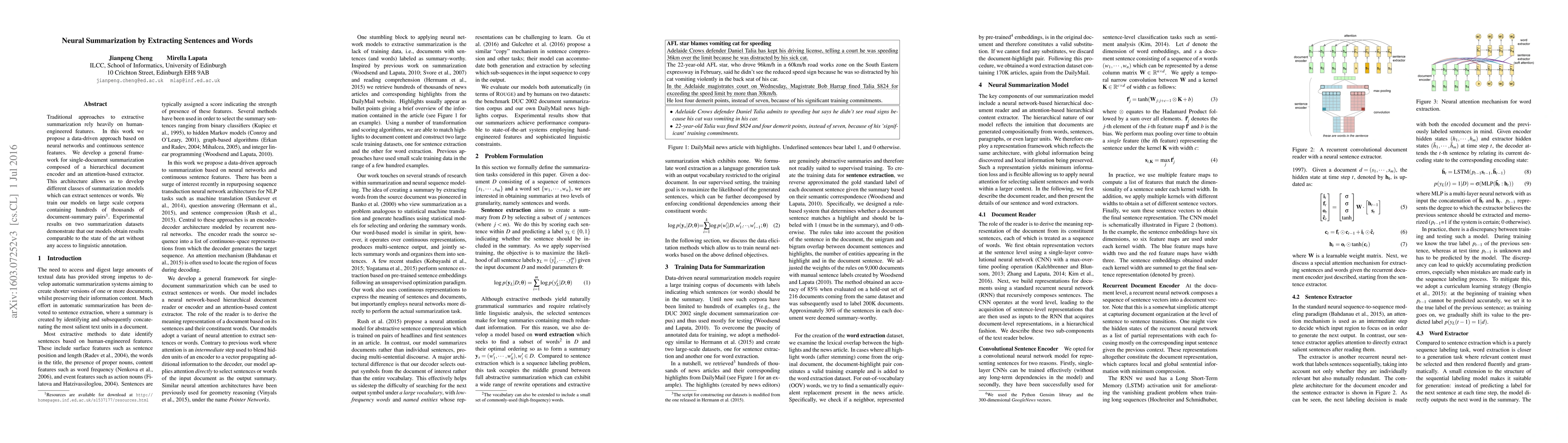 This paper proposes a neural network-based framework for extractive summarization that uses continuous sentence features without relying on human-engineered features. The model employs a hierarchical document encoder and an attention-based extractor, achieving competitive results on summarization datasets without linguistic annotations.