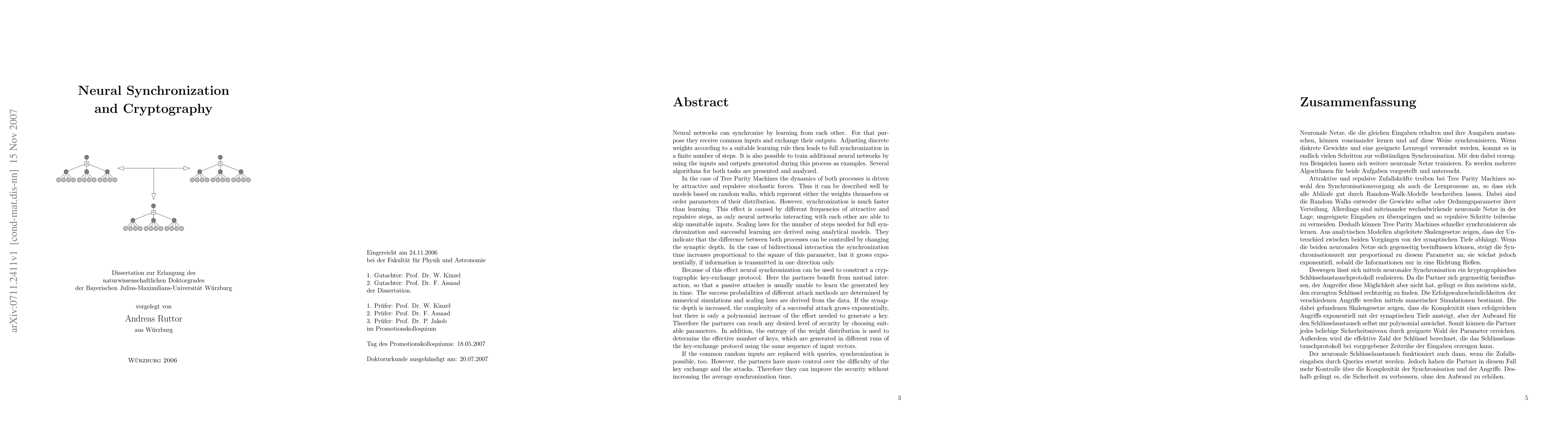 Neural networks can synchronize by learning from each other. In the case of discrete weights full synchronization is achieved in a finite number of steps. Additional networks can be trained by using the inputs and outputs generated during this process as examples. Several learning rules for both tasks are presented and analyzed. In the case of Tree Parity Machines synchronization is much faster than learning. Scaling laws for the number of steps needed for full synchronization and successful learning are derived using analytical models. They indicate that the difference between both processes can be controlled by changing the synaptic depth. In the case of bidirectional interaction the synchronization time increases proportional to the square of this parameter, but it grows exponentially, if information is transmitted in one direction only. Because of this effect neural synchronization can be used to construct a cryptographic key-exchange protocol. Here the partners benefit from mutual interaction, so that a passive attacker is usually unable to learn the generated key in time. The success probabilities of different attack methods are determined by numerical simulations and scaling laws are derived from the data. They show that the partners can reach any desired level of security by just increasing the synaptic depth. Then the complexity of a successful attack grows exponentially, but there is only a polynomial increase of the effort needed to generate a key. Further improvements of security are possible by replacing the random inputs with queries generated by the partners.