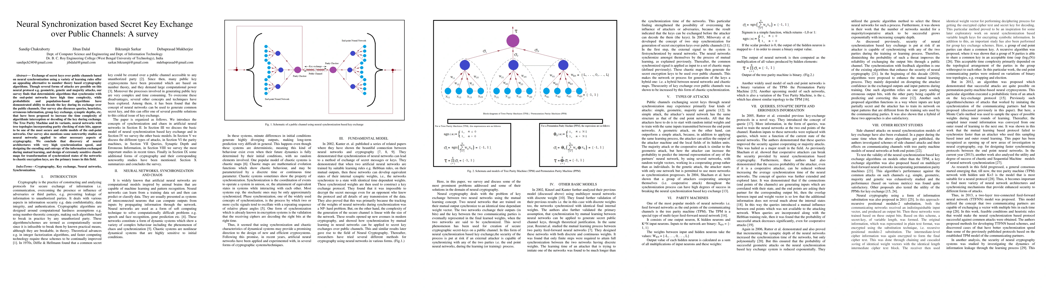 This survey explores secret key exchange over public channels using neural synchronization, highlighting the advantages and vulnerabilities of various learning rules. It finds that while probabilistic and population-based algorithms can decode keys, neural architectures with high synchronization speed and sensitive chaotic maps are crucial for secure key exchange.