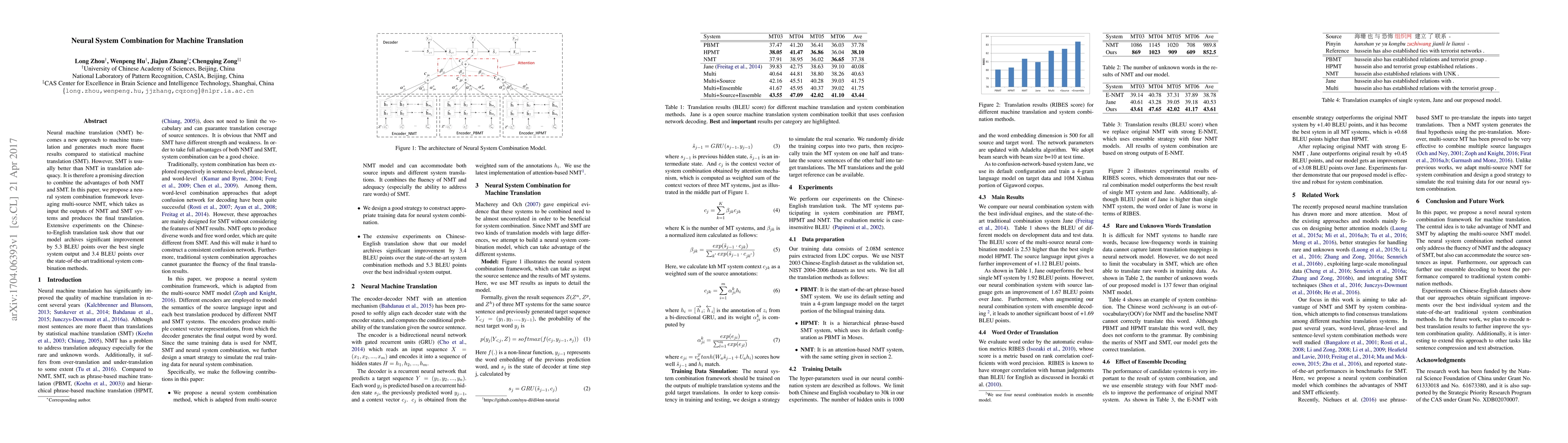 This paper proposes a neural system combination framework that integrates the outputs of neural machine translation (NMT) and statistical machine translation (SMT) to leverage their respective strengths, achieving a 5.3 BLEU point improvement over the best NMT model and a 3.4 BLEU point improvement over existing SMT combination methods in Chinese-to-English translation.