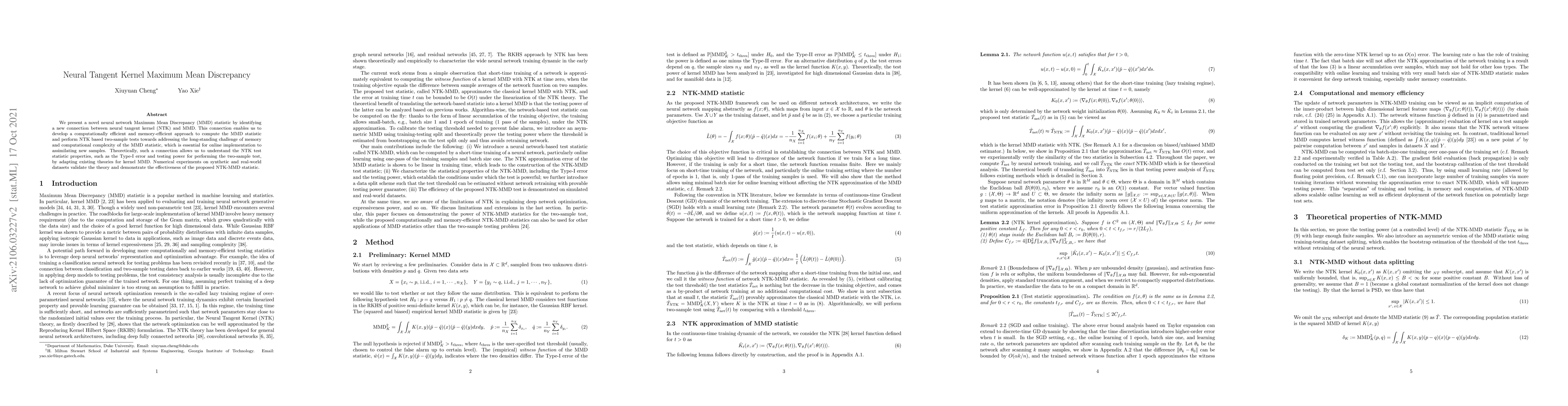 This paper introduces a novel neural network Maximum Mean Discrepancy (MMD) statistic by linking the neural tangent kernel (NTK) with MMD, enabling efficient computation and memory-use. Theoretical and empirical results validate the approach, addressing computational and memory challenges for online sample assimilation.