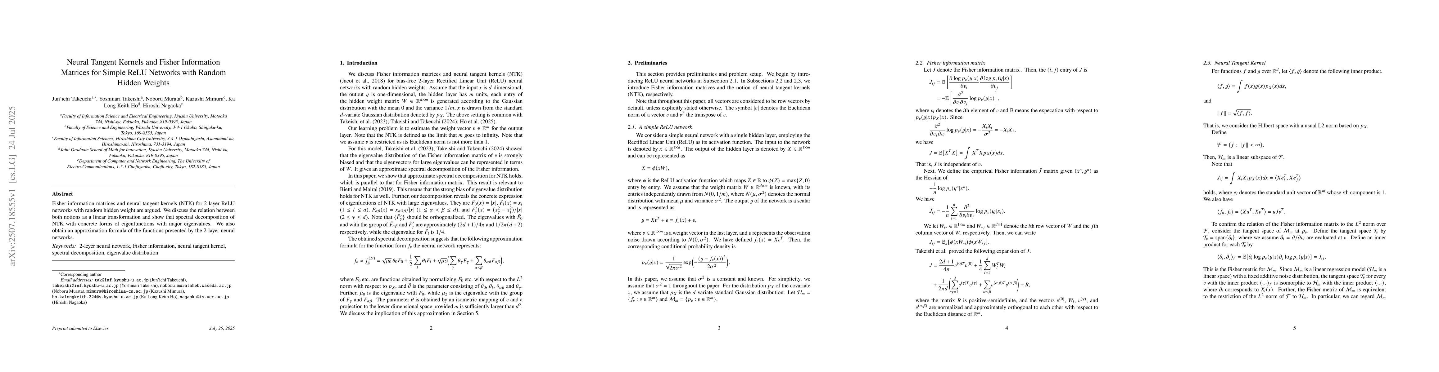 Fisher information matrices and neural tangent kernels (NTK) for 2-layer ReLU networks with random hidden weight are argued. We discuss the relation between both notions as a linear transformation and show that spectral decomposition of NTK with concrete forms of eigenfunctions with major eigenvalues. We also obtain an approximation formula of the functions presented by the 2-layer neural networks.