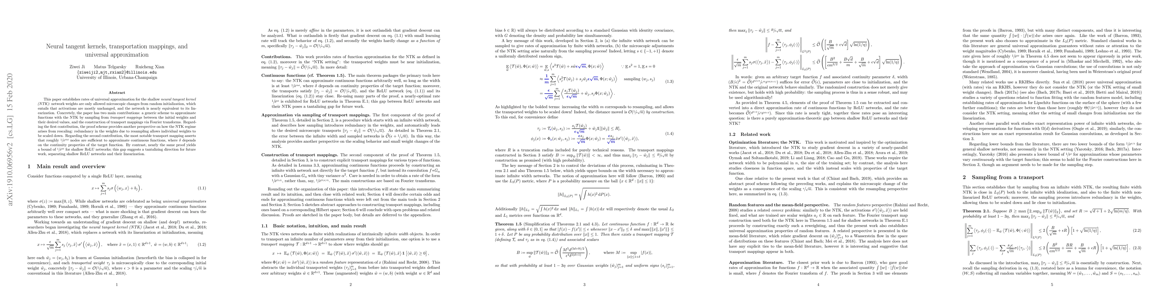 This paper establishes a universal approximation scheme for neural tangent kernels (NTK) networks using transport mappings, allowing for efficient approximation of continuous functions with a small number of nodes. It highlights a surprising gap in approximation rates between NTK and shallow ReLU networks, opening up future research directions.