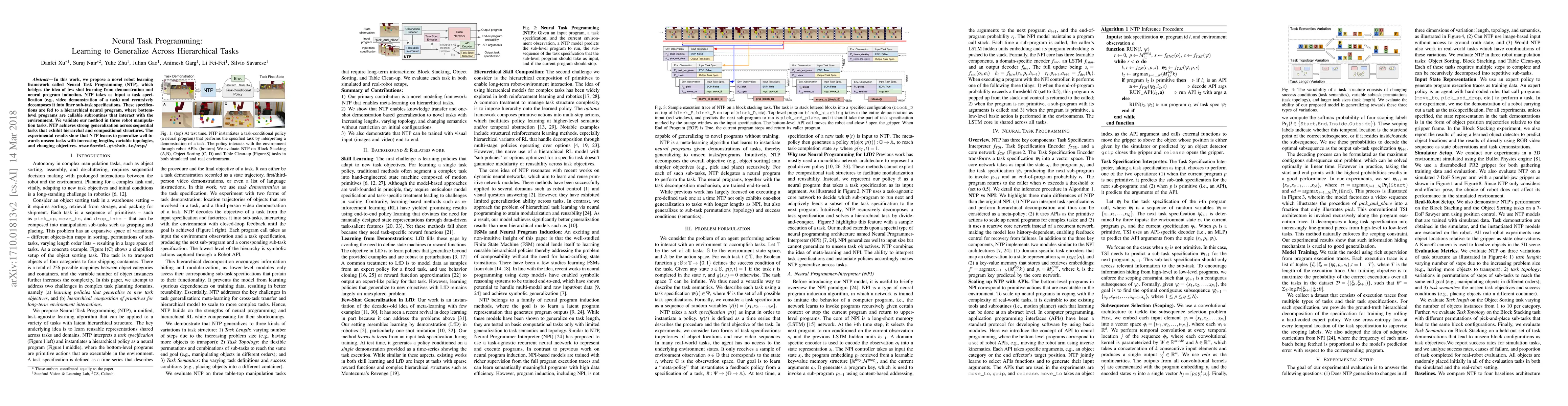 This paper introduces Neural Task Programming (NTP), a framework that combines few-shot learning and neural program induction to enable robots to generalize across hierarchical and compositional tasks. NTP decomposes task specifications into sub-tasks and uses a hierarchical neural program for execution, demonstrating strong generalization in various robot manipulation tasks.