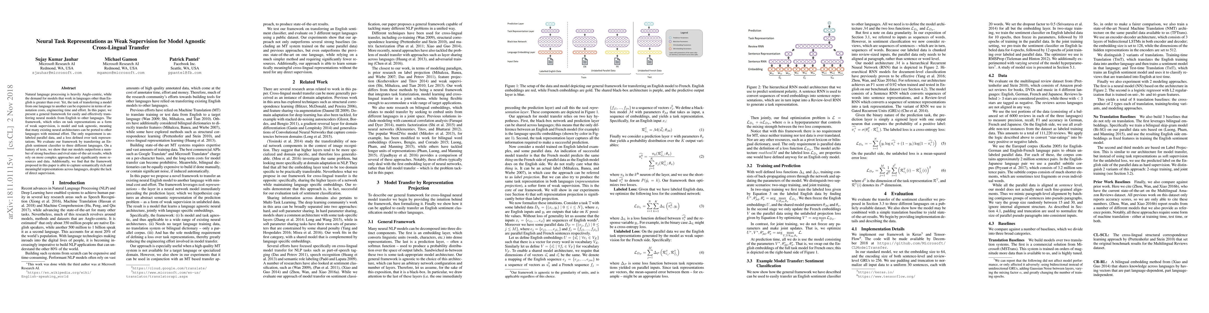 Natural language processing is heavily Anglo-centric, while the demand for models that work in languages other than English is greater than ever. Yet, the task of transferring a model from one language to another can be expensive in terms of annotation costs, engineering time and effort. In this paper, we present a general framework for easily and effectively transferring neural models from English to other languages. The framework, which relies on task representations as a form of weak supervision, is model and task agnostic, meaning that many existing neural architectures can be ported to other languages with minimal effort. The only requirement is unlabeled parallel data, and a loss defined over task representations. We evaluate our framework by transferring an English sentiment classifier to three different languages. On a battery of tests, we show that our models outperform a number of strong baselines and rival state-of-the-art results, which rely on more complex approaches and significantly more resources and data. Additionally, we find that the framework proposed in this paper is able to capture semantically rich and meaningful representations across languages, despite the lack of direct supervision.