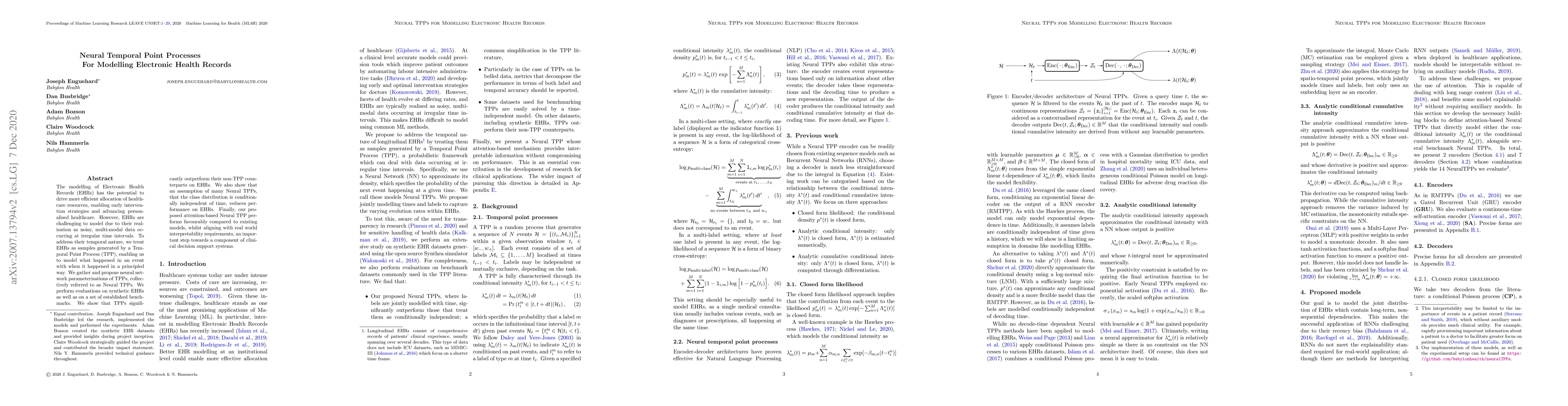 The modelling of Electronic Health Records (EHRs) has the potential to drive more efficient allocation of healthcare resources, enabling early intervention strategies and advancing personalised healthcare. However, EHRs are challenging to model due to their realisation as noisy, multi-modal data occurring at irregular time intervals. To address their temporal nature, we treat EHRs as samples generated by a Temporal Point Process (TPP), enabling us to model what happened in an event with when it happened in a principled way. We gather and propose neural network parameterisations of TPPs, collectively referred to as Neural TPPs. We perform evaluations on synthetic EHRs as well as on a set of established benchmarks. We show that TPPs significantly outperform their non-TPP counterparts on EHRs. We also show that an assumption of many Neural TPPs, that the class distribution is conditionally independent of time, reduces performance on EHRs. Finally, our proposed attention-based Neural TPP performs favourably compared to existing models, whilst aligning with real world interpretability requirements, an important step towards a component of clinical decision support systems.