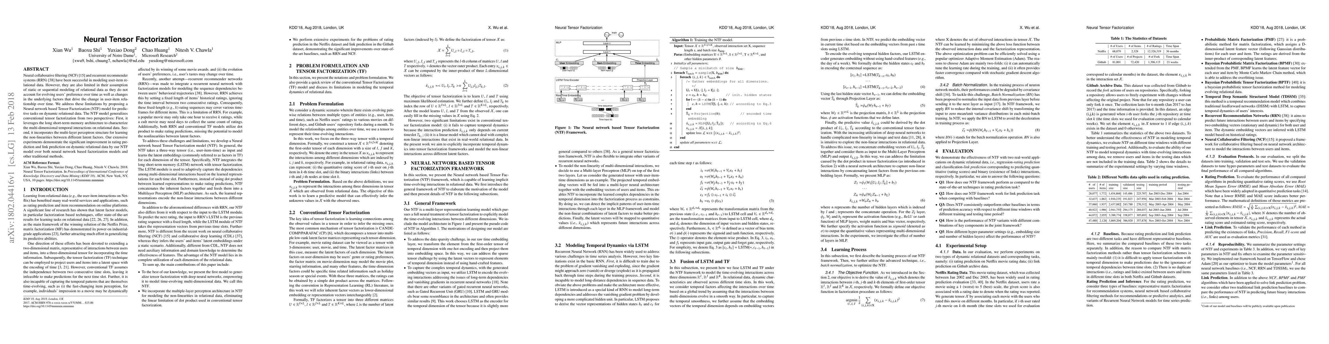 Neural Tensor Factorization (NTF) model enhances neural collaborative filtering and recurrent recommender systems by addressing limitations in modeling evolving user preferences and dynamic relational data. The NTF leverages LSTM for temporal interactions and MLP for non-linear latent factor learning, showing superior performance in rating and link prediction tasks.