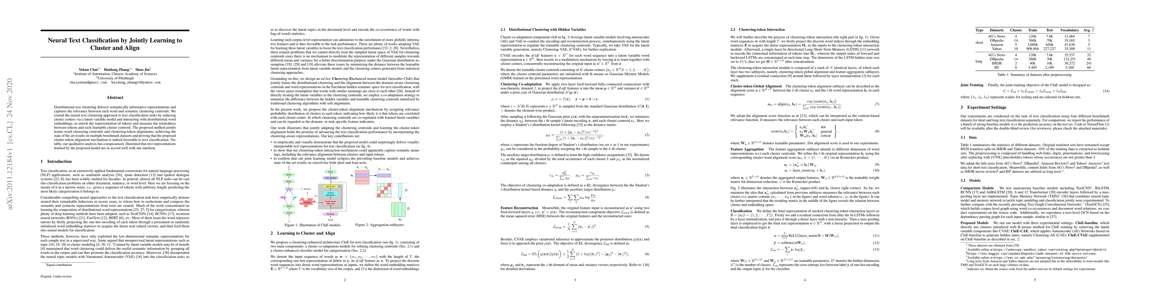 This paper proposes a neural text classification method that jointly learns word clustering centroids and alignments between tokens and clusters, achieving state-of-the-art results on benchmark datasets. The method enriches token representations and demonstrates favorable performance through qualitative analysis that aligns well with human intuition.