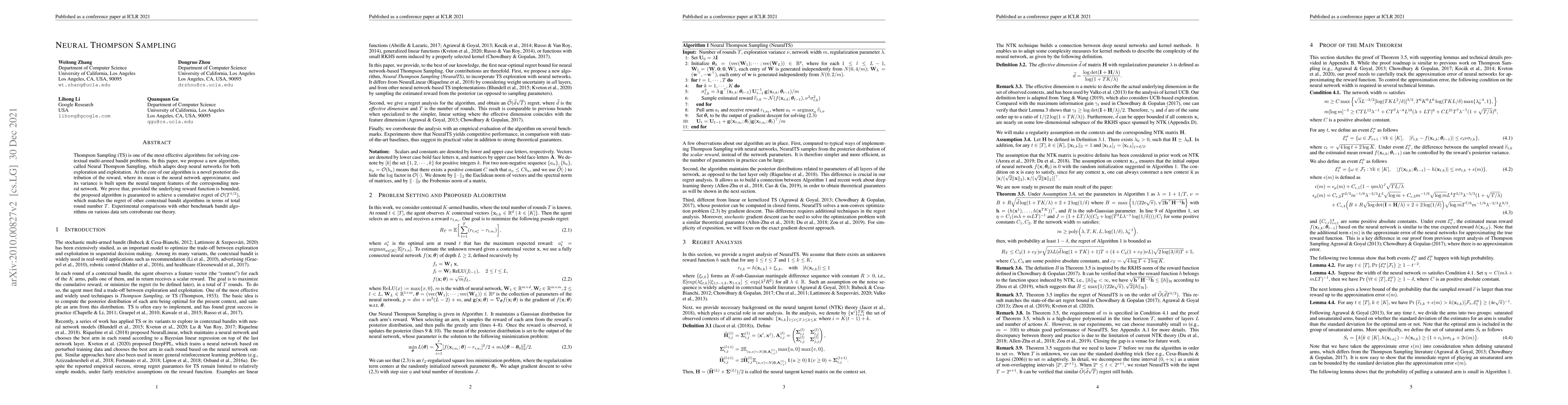 Neural Thompson Sampling adapts deep neural networks for both exploration and exploitation in contextual multi-armed bandit problems. The algorithm uses a neural network approximator for the mean and neural tangent features for variance, achieving a cumulative regret of $\mathcal{O}(T^{1/2})$, matching other contextual bandit algorithms.