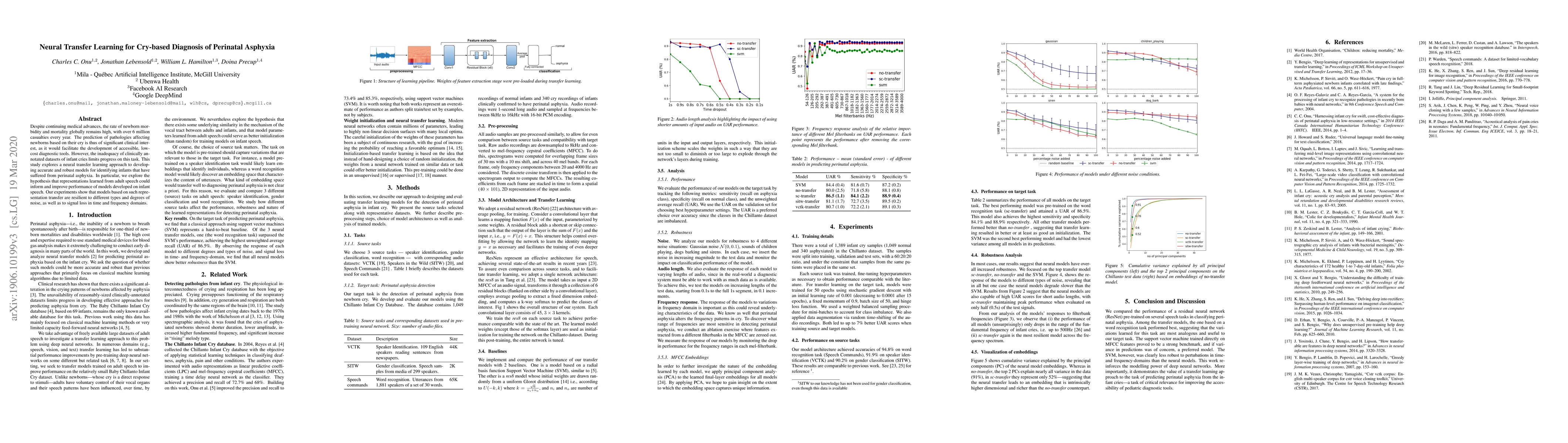 This research proposes a neural transfer learning method to diagnose perinatal asphyxia in newborns using their cry. It demonstrates that representations from adult speech can enhance model performance on infant cries, making the system robust against noise and signal loss. This approach could lead to affordable, accessible diagnostic tools for high newborn mortality rates.
