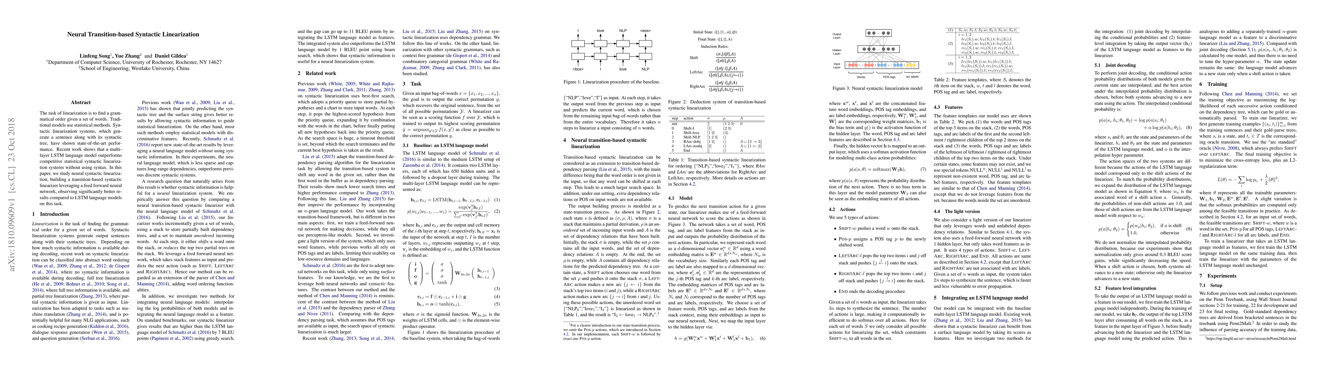 This paper proposes a neural transition-based syntactic linearizer using a feed-forward neural network, achieving superior performance over multi-layer LSTM language models for the task of syntactic linearization. The approach demonstrates the effectiveness of neural methods in generating grammatically ordered sentences.