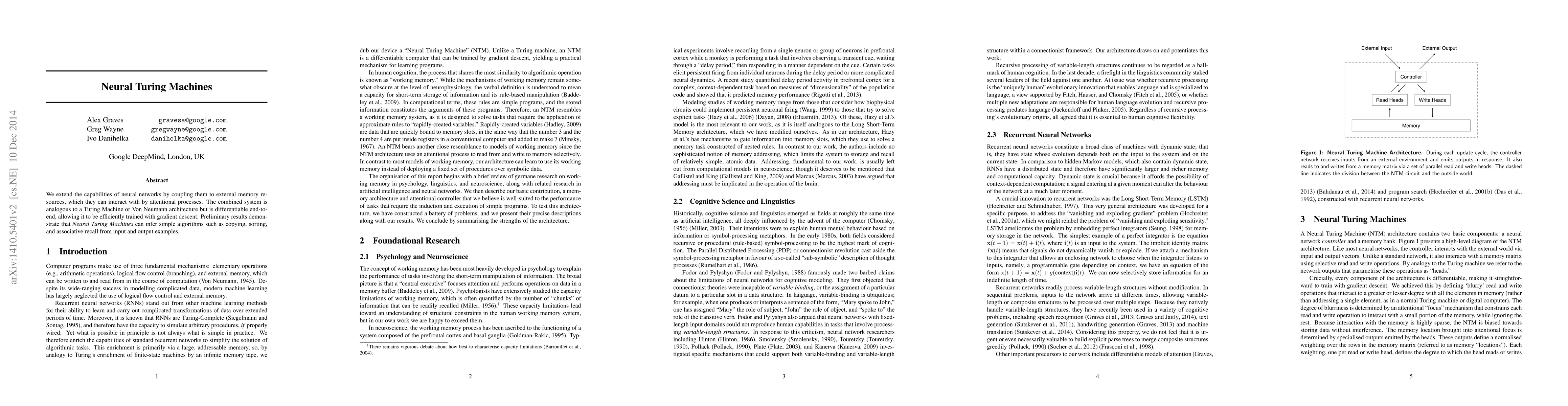 We extend the capabilities of neural networks by coupling them to external memory resources, which they can interact with by attentional processes. The combined system is analogous to a Turing Machine or Von Neumann architecture but is differentiable end-to-end, allowing it to be efficiently trained with gradient descent. Preliminary results demonstrate that Neural Turing Machines can infer simple algorithms such as copying, sorting, and associative recall from input and output examples.
