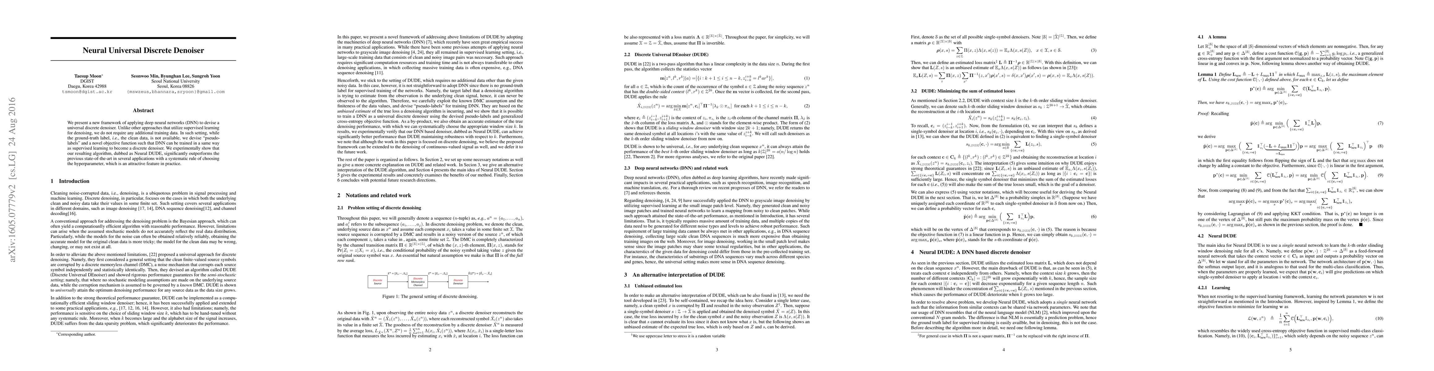 The Neural Universal Discrete Denoiser (Neural DUDE) framework leverages deep neural networks without requiring additional training data, using pseudo-labels and a novel objective function. It outperforms previous state-of-the-art methods in various applications, with an advantageous systematic hyperparameter selection.
