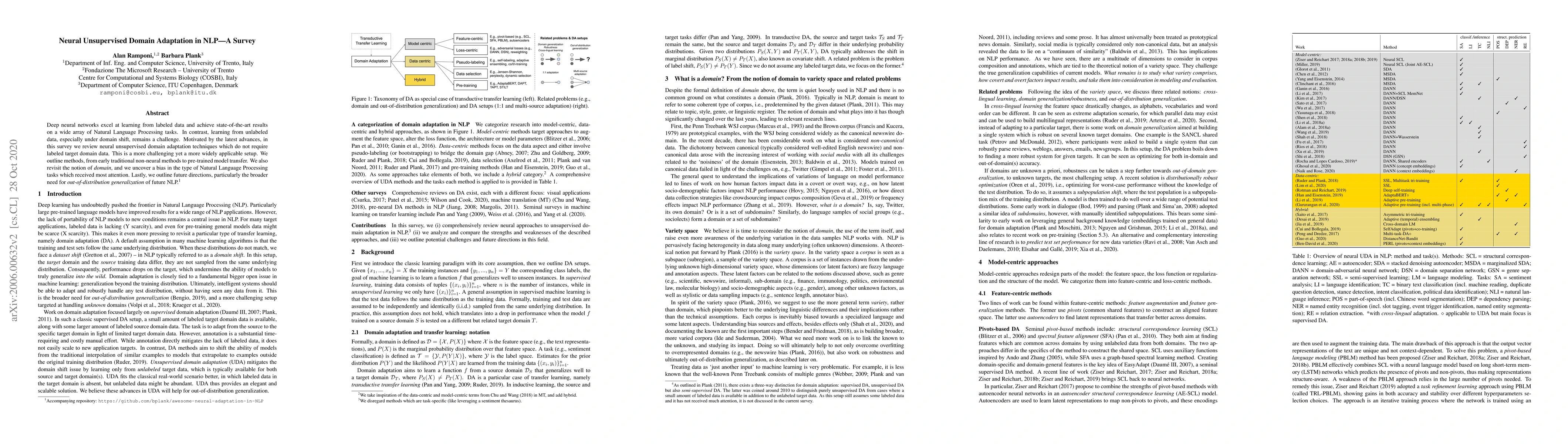 This survey reviews neural unsupervised domain adaptation techniques in NLP, focusing on methods that do not require labeled data from the target domain. It covers traditional non-neural methods to modern pre-trained model transfers, highlighting the challenges and biases in current research, and suggests future directions for out-of-distribution generalization.