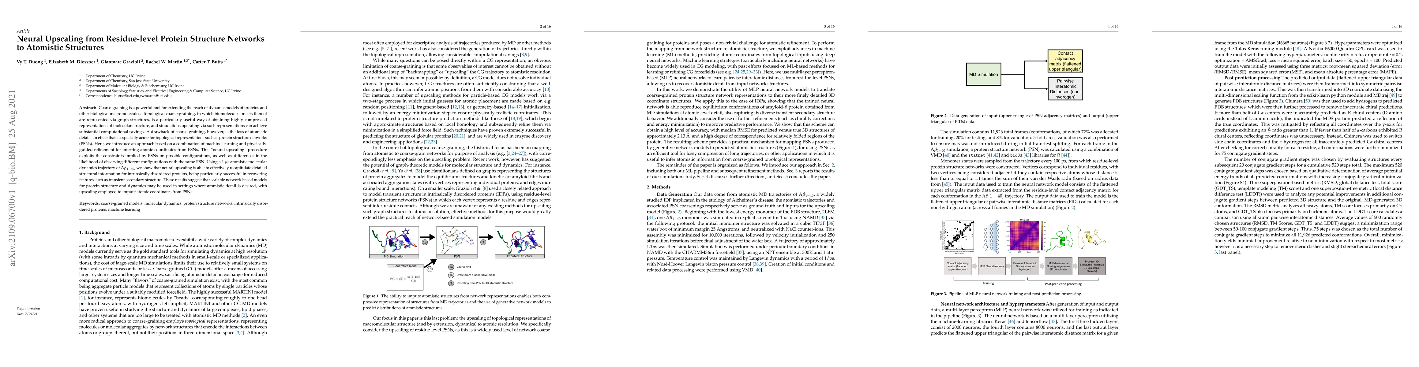 Coarse-graining is a powerful tool for extending the reach of dynamic models of proteins and other biological macromolecules. Topological coarse-graining, in which biomolecules or sets thereof are represented via graph structures, is a particularly useful way of obtaining highly compressed representations of molecular structure, and simulations operating via such representations can achieve substantial computational savings. A drawback of coarse-graining, however, is the loss of atomistic detail - an effect that is especially acute for topological representations such as protein structure networks (PSNs). Here, we introduce an approach based on a combination of machine learning and physically-guided refinement for inferring atomic coordinates from PSNs. This "neural upscaling" procedure exploits the constraints implied by PSNs on possible configurations, as well as differences in the likelihood of observing different configurations with the same PSN. Using a 1 $\mu$s atomistic molecular dynamics trajectory of A$\beta_{1-40}$, we show that neural upscaling is able to effectively recapitulate detailed structural information for intrinsically disordered proteins, being particularly successful in recovering features such as transient secondary structure. These results suggest that scalable network-based models for protein structure and dynamics may be used in settings where atomistic detail is desired, with upscaling employed to impute atomic coordinates from PSNs.