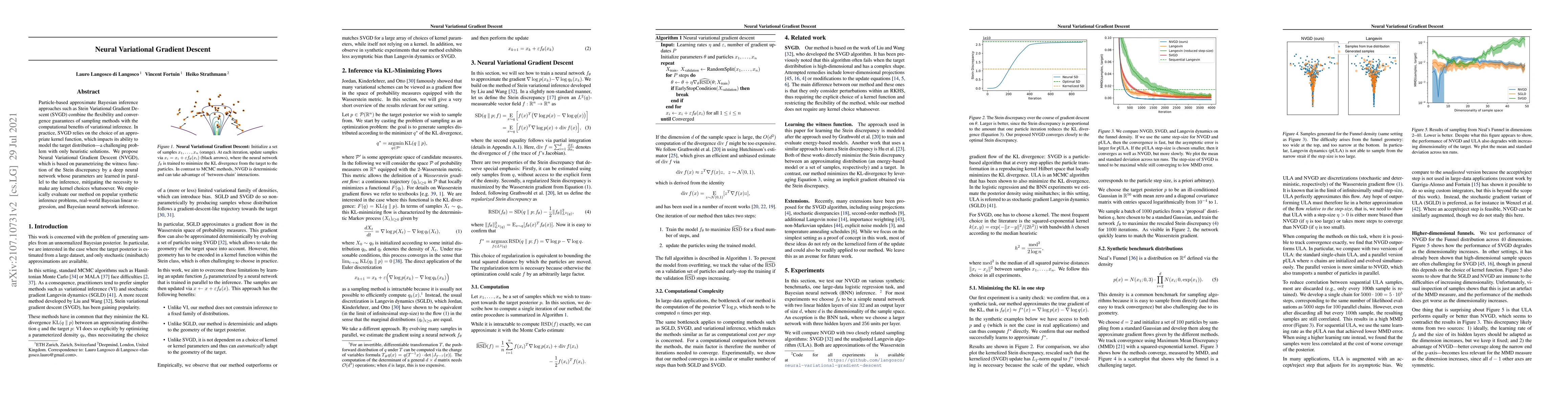 Neural Variational Gradient Descent (NVGD) parameterizes the witness function of the Stein discrepancy using a deep neural network, eliminating the need for kernel selection. Empirical evaluations show its effectiveness on synthetic problems, Bayesian linear regression, and Bayesian neural network inference.