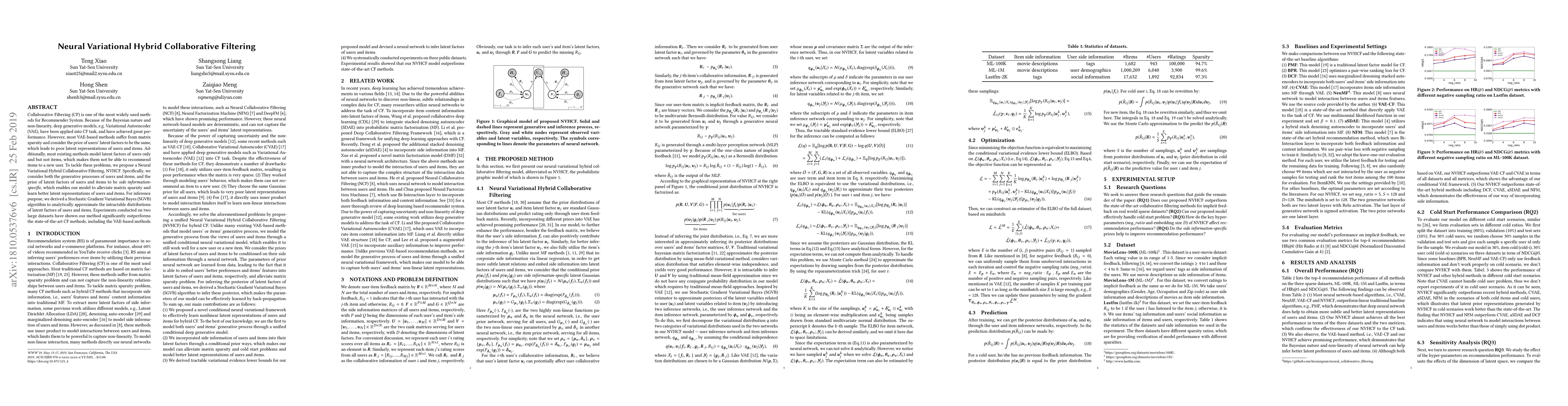 The paper proposes Neural Variational Hybrid Collaborative Filtering (NVHCF) to improve recommender systems by leveraging Variational Autoencoders to better model both users and items, addressing matrix sparsity and providing improved latent representations. The method outperforms existing state-of-the-art collaborative filtering techniques on large datasets.