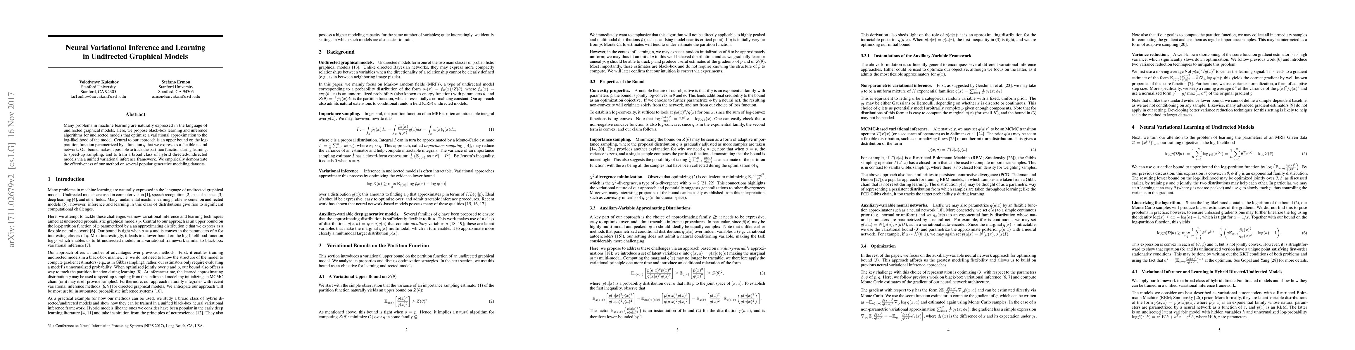 Many problems in machine learning are naturally expressed in the language of undirected graphical models. Here, we propose black-box learning and inference algorithms for undirected models that optimize a variational approximation to the log-likelihood of the model. Central to our approach is an upper bound on the log-partition function parametrized by a function q that we express as a flexible neural network. Our bound makes it possible to track the partition function during learning, to speed-up sampling, and to train a broad class of hybrid directed/undirected models via a unified variational inference framework. We empirically demonstrate the effectiveness of our method on several popular generative modeling datasets.
