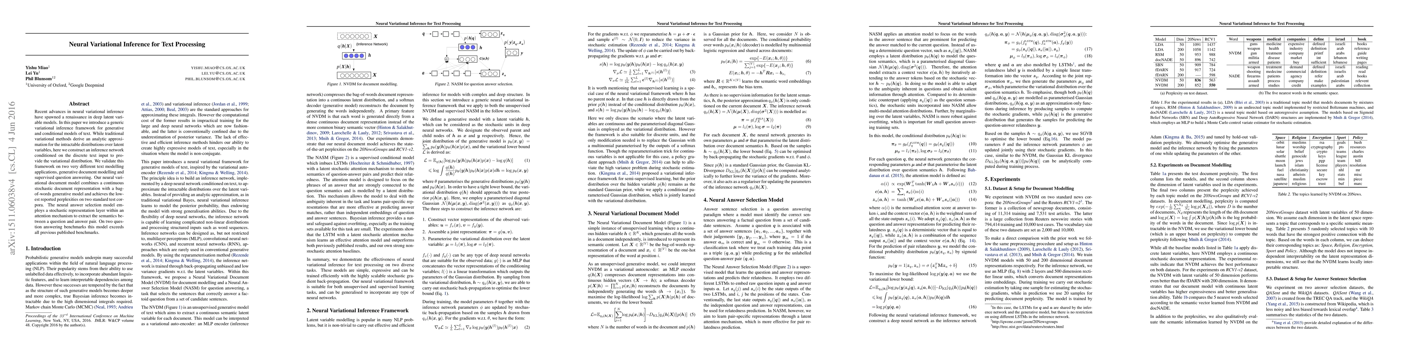 This paper proposes a neural variational inference framework for text processing, utilizing an inference network conditioned on discrete text input to approximate intractable distributions. The framework is validated on generative document modeling and supervised question answering, achieving state-of-the-art results in both applications.