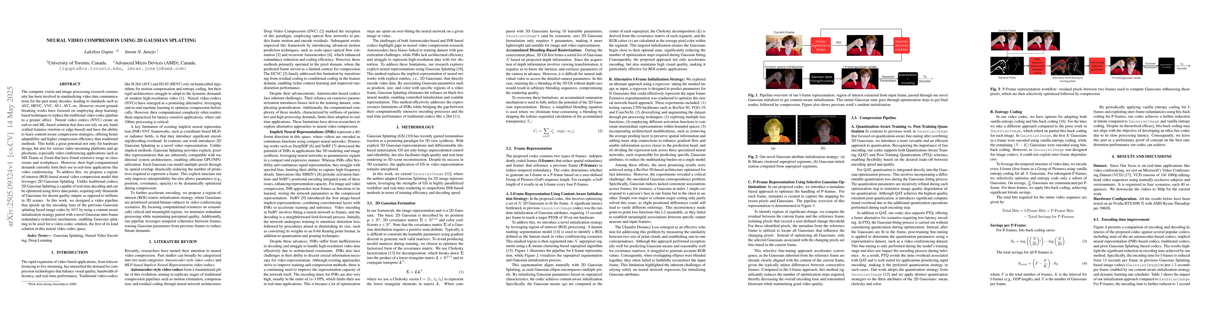 The computer vision and image processing research community has been involved in standardizing video data communications for the past many decades, leading to standards such as AVC, HEVC, VVC, AV1, AV2, etc. However, recent groundbreaking works have focused on employing deep learning-based techniques to replace the traditional video codec pipeline to a greater affect. Neural video codecs (NVC) create an end-to-end ML-based solution that does not rely on any handcrafted features (motion or edge-based) and have the ability to learn content-aware compression strategies, offering better adaptability and higher compression efficiency than traditional methods. This holds a great potential not only for hardware design, but also for various video streaming platforms and applications, especially video conferencing applications such as MS-Teams or Zoom that have found extensive usage in classrooms and workplaces. However, their high computational demands currently limit their use in real-time applications like video conferencing. To address this, we propose a region-of-interest (ROI) based neural video compression model that leverages 2D Gaussian Splatting. Unlike traditional codecs, 2D Gaussian Splatting is capable of real-time decoding and can be optimized using fewer data points, requiring only thousands of Gaussians for decent quality outputs as opposed to millions in 3D scenes. In this work, we designed a video pipeline that speeds up the encoding time of the previous Gaussian splatting-based image codec by 88% by using a content-aware initialization strategy paired with a novel Gaussian inter-frame redundancy-reduction mechanism, enabling Gaussian splatting to be used for a video-codec solution, the first of its kind solution in this neural video codec space.