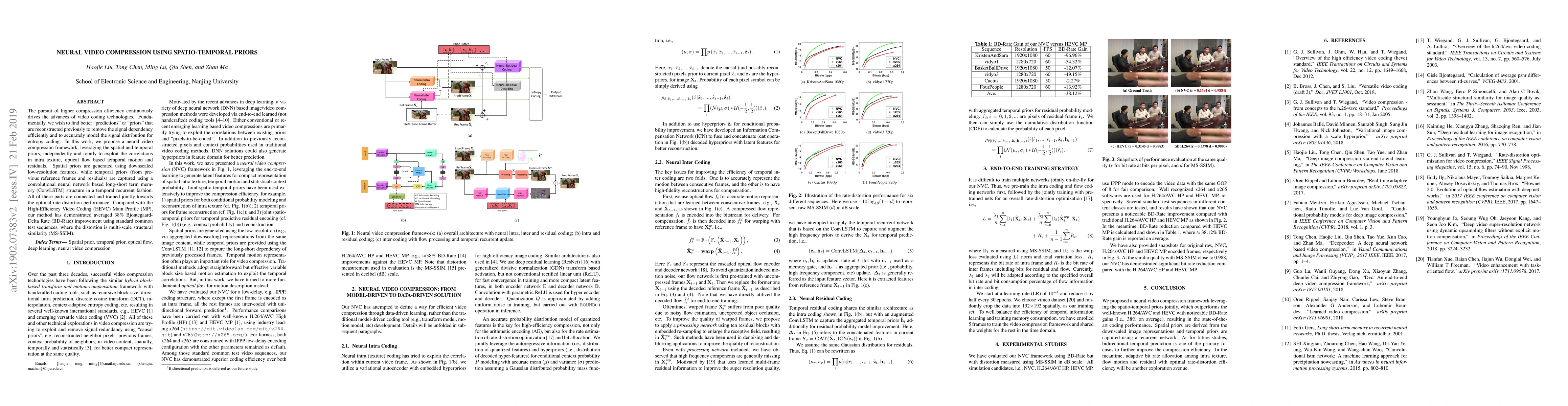 This paper proposes a neural video compression framework that utilizes spatial and temporal priors to enhance compression efficiency. It employs downscaled low-resolution features for spatial priors and a ConvLSTM network for temporal priors, achieving a 38% improvement over HEVC Main Profile in rate-distortion performance.