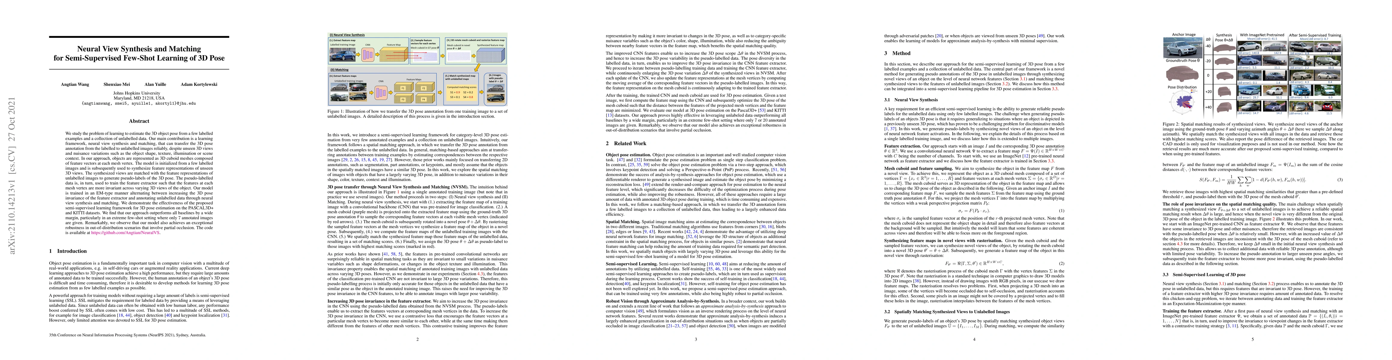 We study the problem of learning to estimate the 3D object pose from a few labelled examples and a collection of unlabelled data. Our main contribution is a learning framework, neural view synthesis and matching, that can transfer the 3D pose annotation from the labelled to unlabelled images reliably, despite unseen 3D views and nuisance variations such as the object shape, texture, illumination or scene context. In our approach, objects are represented as 3D cuboid meshes composed of feature vectors at each mesh vertex. The model is initialized from a few labelled images and is subsequently used to synthesize feature representations of unseen 3D views. The synthesized views are matched with the feature representations of unlabelled images to generate pseudo-labels of the 3D pose. The pseudo-labelled data is, in turn, used to train the feature extractor such that the features at each mesh vertex are more invariant across varying 3D views of the object. Our model is trained in an EM-type manner alternating between increasing the 3D pose invariance of the feature extractor and annotating unlabelled data through neural view synthesis and matching. We demonstrate the effectiveness of the proposed semi-supervised learning framework for 3D pose estimation on the PASCAL3D+ and KITTI datasets. We find that our approach outperforms all baselines by a wide margin, particularly in an extreme few-shot setting where only 7 annotated images are given. Remarkably, we observe that our model also achieves an exceptional robustness in out-of-distribution scenarios that involve partial occlusion.