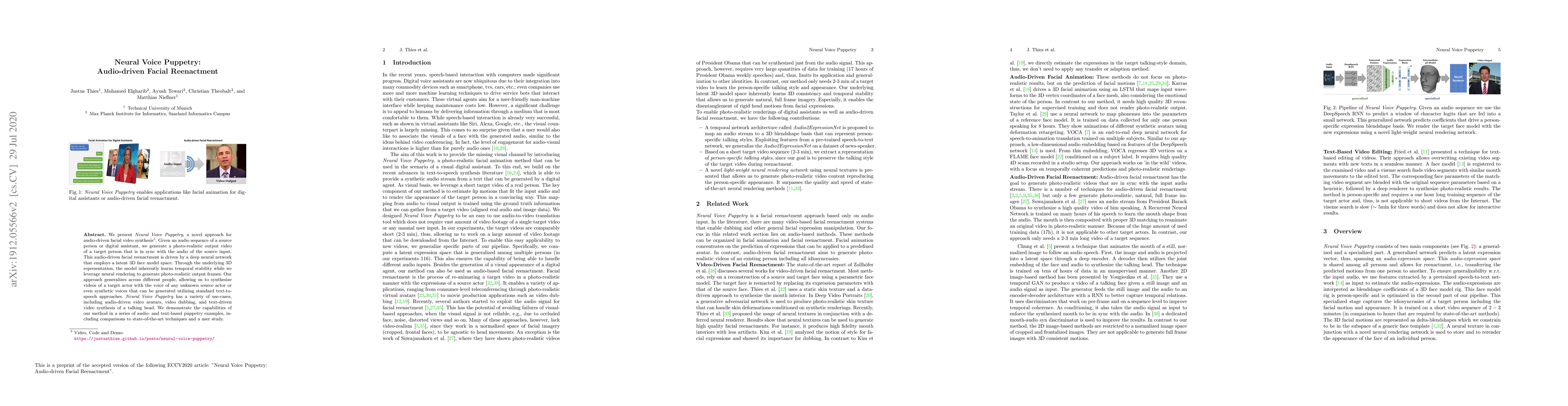 Neural Voice Puppetry synthesizes photo-realistic facial videos in sync with any audio input using a deep neural network and a latent 3D face model, enabling applications like video avatars and dubbing. The method is shown to generalize across different people and is compared to state-of-the-art techniques.