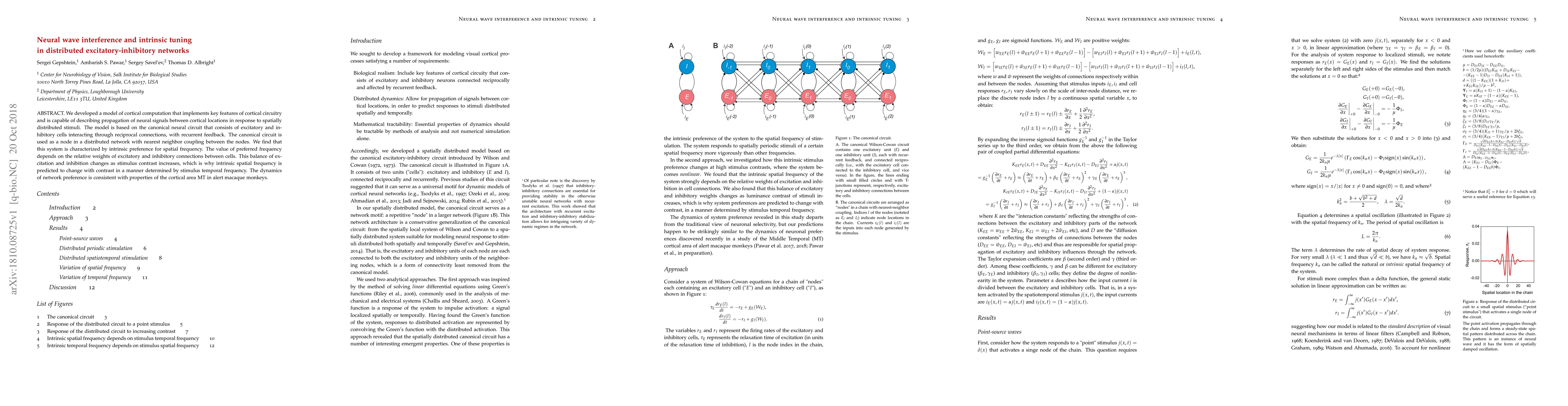 We developed a model of cortical computation that implements key features of cortical circuitry and is capable of describing propagation of neural signals between cortical locations in response to spatially distributed stimuli. The model is based on the canonical neural circuit that consists of excitatory and inhibitory cells interacting through reciprocal connections, with recurrent feedback. The canonical circuit is used as a node in a distributed network with nearest neighbor coupling between the nodes. We find that this system is characterized by intrinsic preference for spatial frequency. The value of preferred frequency depends on the relative weights of excitatory and inhibitory connections between cells. This balance of excitation and inhibition changes as stimulus contrast increases, which is why intrinsic spatial frequency is predicted to change with contrast in a manner determined by stimulus temporal frequency. The dynamics of network preference is consistent with properties of the cortical area MT in alert macaque monkeys.