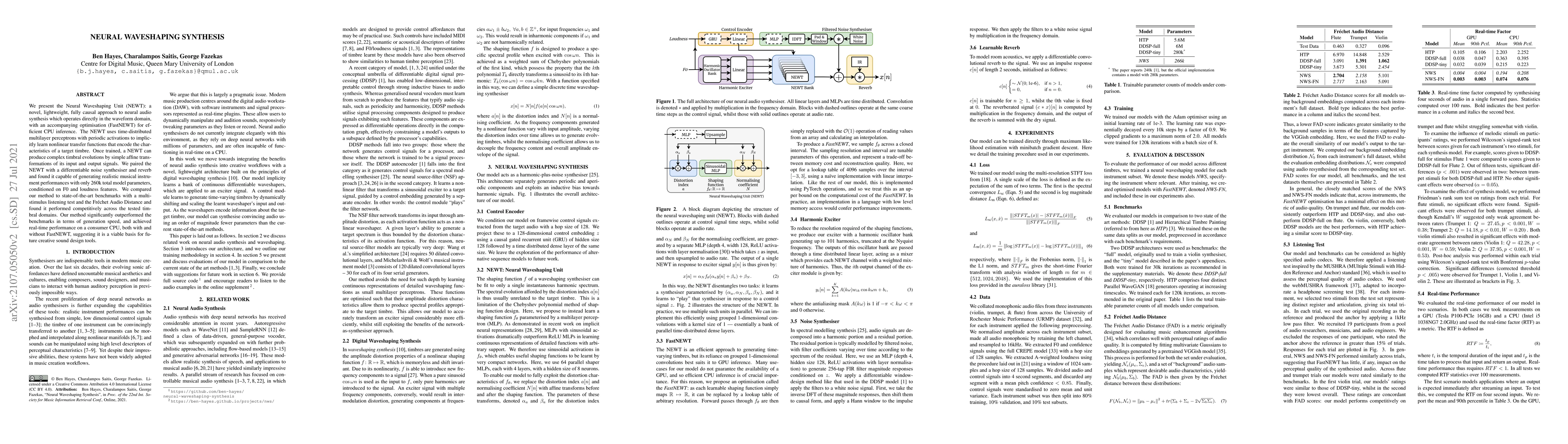 A new neural audio synthesis method called NEWT produces realistic musical instrument performances with a small number of parameters, outperforming state-of-the-art methods in generation speed and real-time performance.