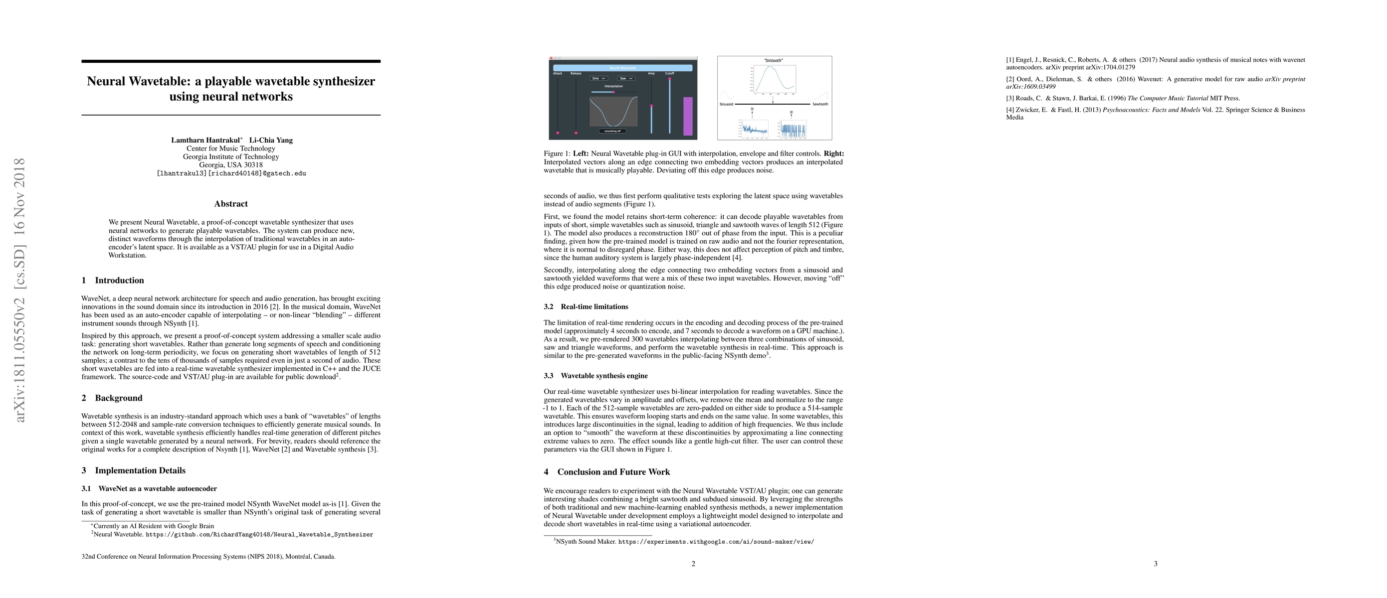 Summary: Neural Wavetable employs neural networks to create and interpolate unique waveforms in a wavetable synthesizer, offering a novel, playable wavetable experience via a VST/AU plugin in Digital Audio Workstations.