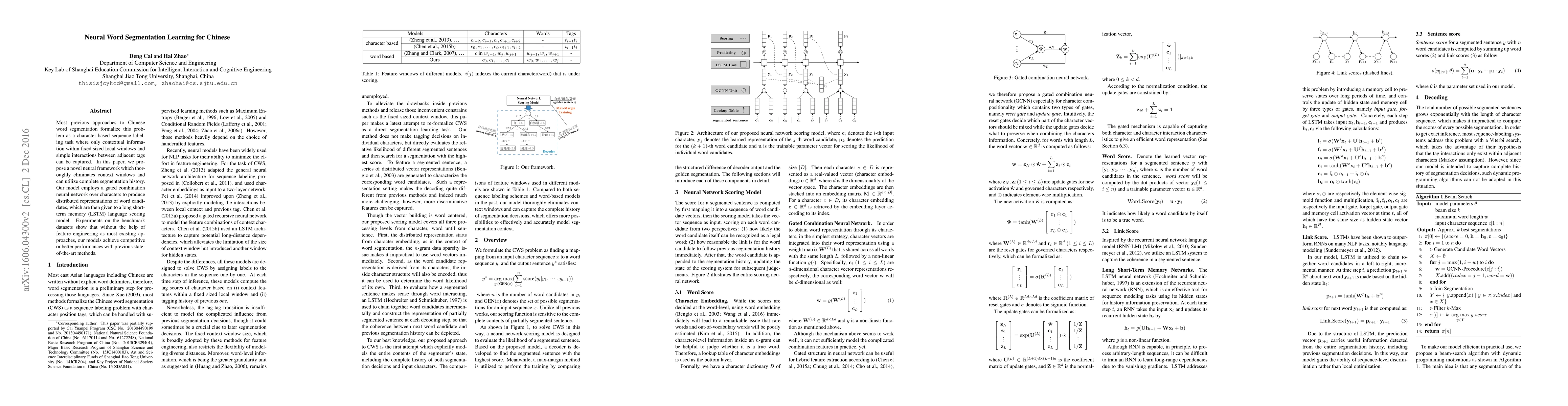 This paper introduces a neural framework for Chinese word segmentation that discards local context windows and uses a LSTM model to score word candidates based on their complete segmentation history, achieving competitive results without relying on traditional feature engineering.