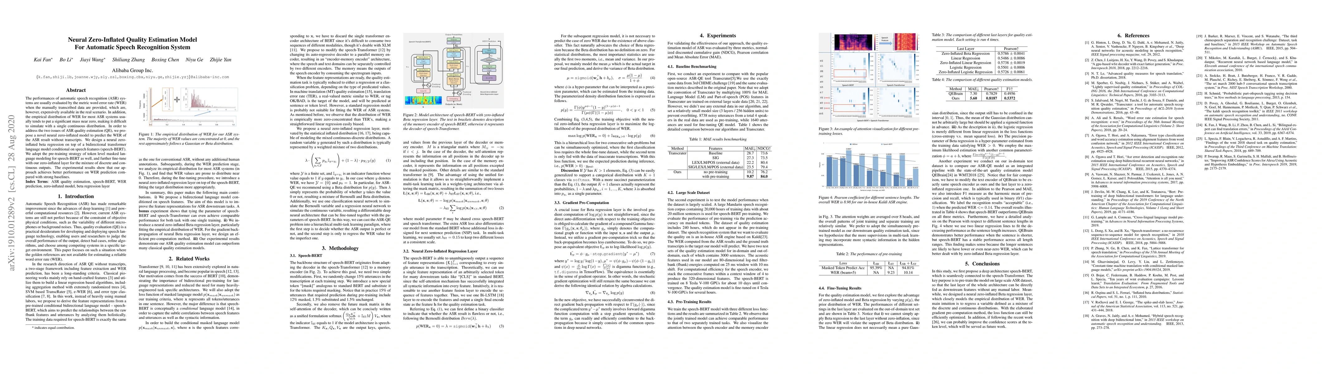 The performances of automatic speech recognition (ASR) systems are usually evaluated by the metric word error rate (WER) when the manually transcribed data are provided, which are, however, expensively available in the real scenario. In addition, the empirical distribution of WER for most ASR systems usually tends to put a significant mass near zero, making it difficult to simulate with a single continuous distribution. In order to address the two issues of ASR quality estimation (QE), we propose a novel neural zero-inflated model to predict the WER of the ASR result without transcripts. We design a neural zero-inflated beta regression on top of a bidirectional transformer language model conditional on speech features (speech-BERT). We adopt the pre-training strategy of token level mask language modeling for speech-BERT as well, and further fine-tune with our zero-inflated layer for the mixture of discrete and continuous outputs. The experimental results show that our approach achieves better performance on WER prediction in the metrics of Pearson and MAE, compared with most existed quality estimation algorithms for ASR or machine translation.