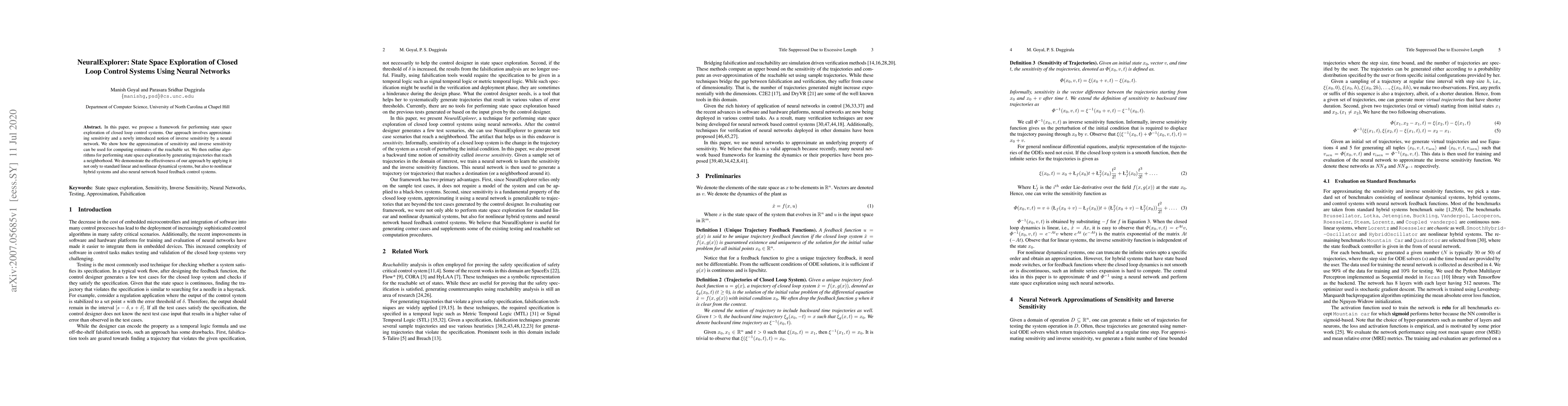 In this paper, we propose a framework for performing state space exploration of closed loop control systems. Our approach involves approximating sensitivity and a newly introduced notion of inverse sensitivity by a neural network. We show how the approximation of sensitivity and inverse sensitivity can be used for computing estimates of the reachable set. We then outline algorithms for performing state space exploration by generating trajectories that reach a neighborhood. We demonstrate the effectiveness of our approach by applying it not only to standard linear and nonlinear dynamical systems, but also to nonlinear hybrid systems and also neural network based feedback control systems.