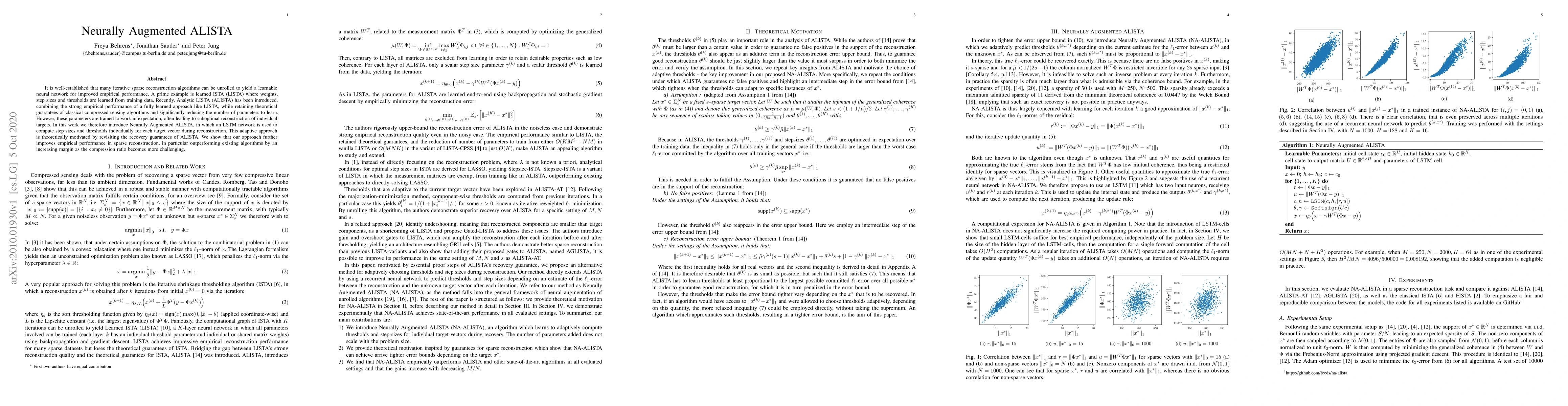 Neurally Augmented ALISTA combines an LSTM network to adaptively compute step sizes and thresholds for each target vector, enhancing ALISTA's performance in sparse reconstruction. This approach improves empirical results, especially under high compression ratios, while maintaining theoretical guarantees.