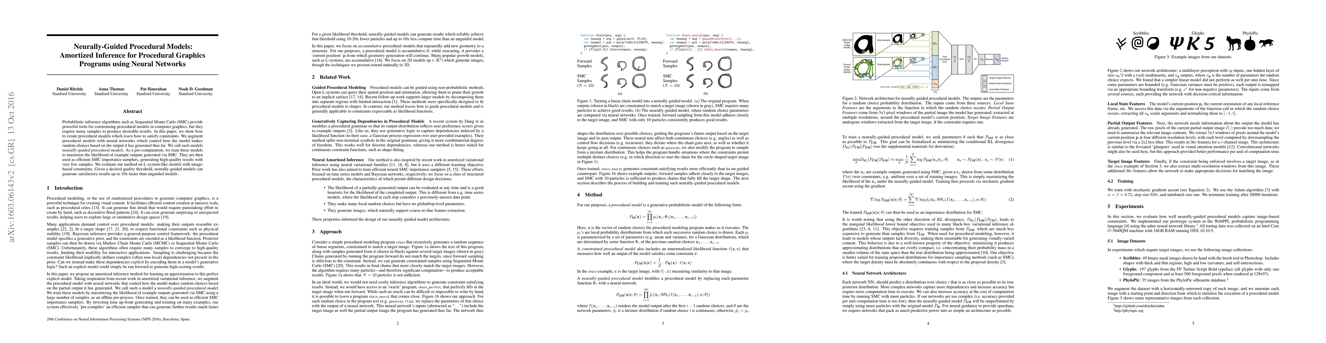 This paper introduces neurally-guided procedural models that use neural networks to efficiently guide procedural graphics programs. These models are trained to maximize likelihood based on example outputs, enabling them to generate high-quality results with significantly fewer samples compared to traditional methods, up to 10x faster.