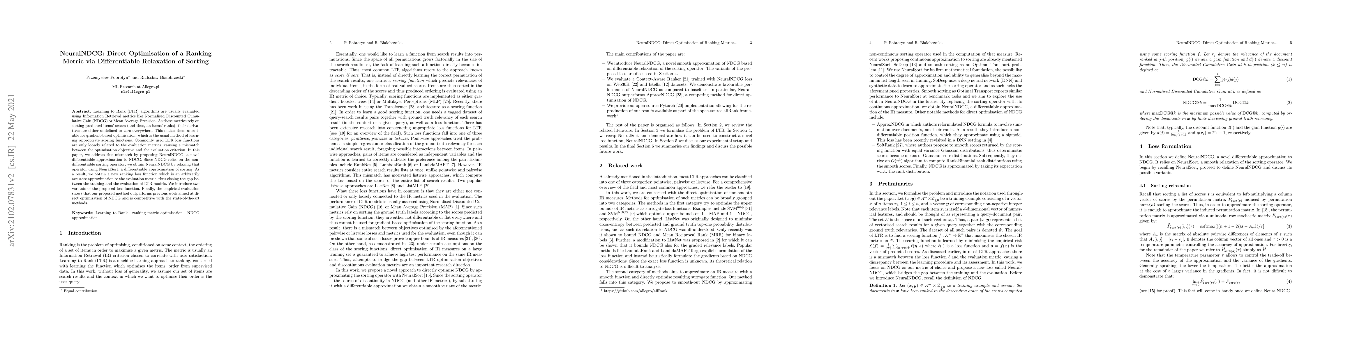 This paper introduces NeuralNDCG, a differentiable approximation of the NDCG metric for direct optimisation in Learning to Rank algorithms. By using NeuralSort to relax the non-differentiable sorting operation, NeuralNDCG provides a gradient-based loss function that closely aligns training with evaluation metrics, outperforming previous methods.