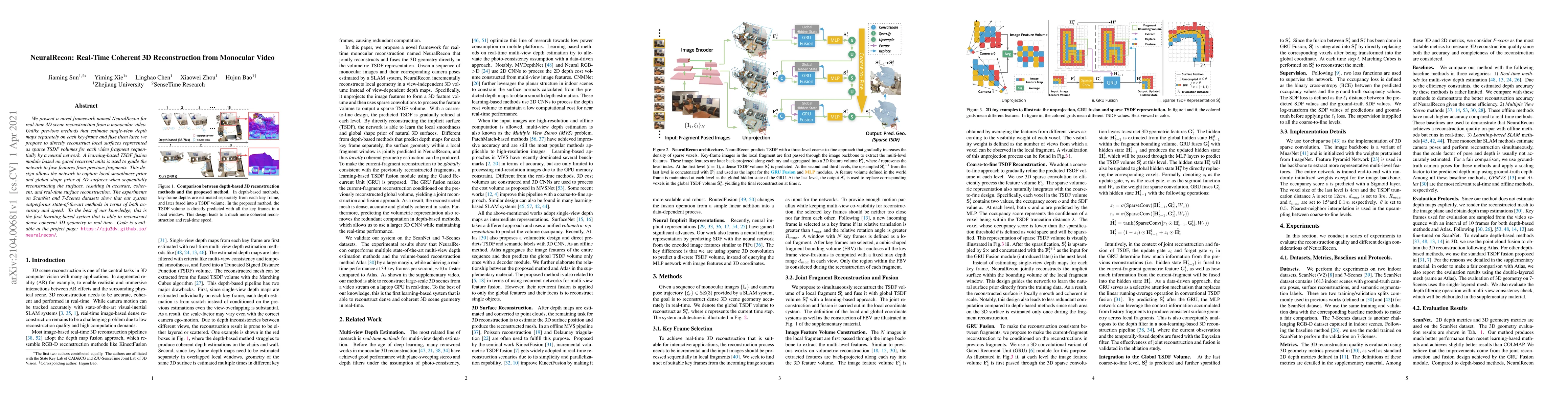 NeuralRecon presents a real-time framework for coherent 3D reconstruction from monocular video, employing neural networks to sequentially reconstruct sparse TSDF volumes, and a TSDF fusion module to capture local and global shape priors for accurate, real-time results. The method outperforms existing techniques in both accuracy and speed on ScanNet and 7-Scenes datasets.