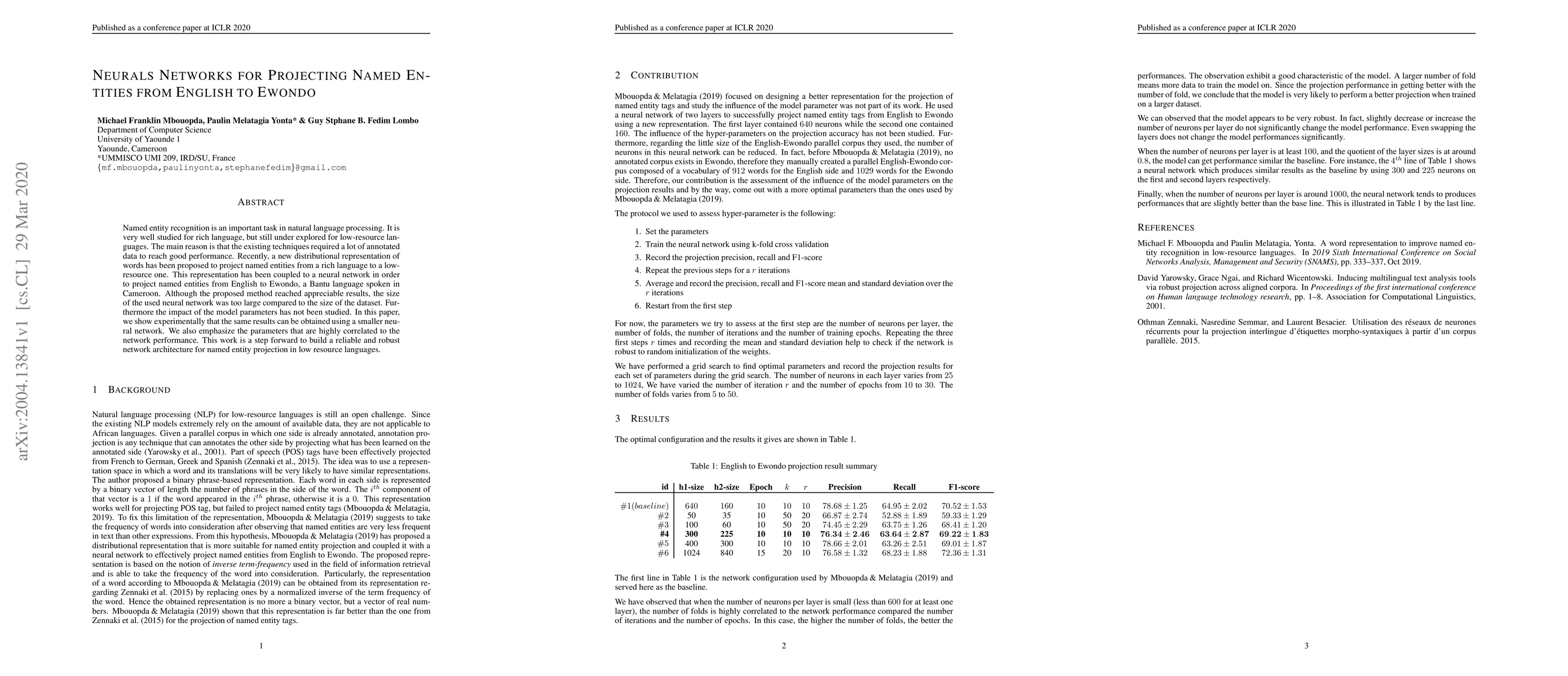 Named entity recognition is an important task in natural language processing. It is very well studied for rich language, but still under explored for low-resource languages. The main reason is that the existing techniques required a lot of annotated data to reach good performance. Recently, a new distributional representation of words has been proposed to project named entities from a rich language to a low-resource one. This representation has been coupled to a neural network in order to project named entities from English to Ewondo, a Bantu language spoken in Cameroon. Although the proposed method reached appreciable results, the size of the used neural network was too large compared to the size of the dataset. Furthermore the impact of the model parameters has not been studied. In this paper, we show experimentally that the same results can be obtained using a smaller neural network. We also emphasize the parameters that are highly correlated to the network performance. This work is a step forward to build a reliable and robust network architecture for named entity projection in low resource languages.