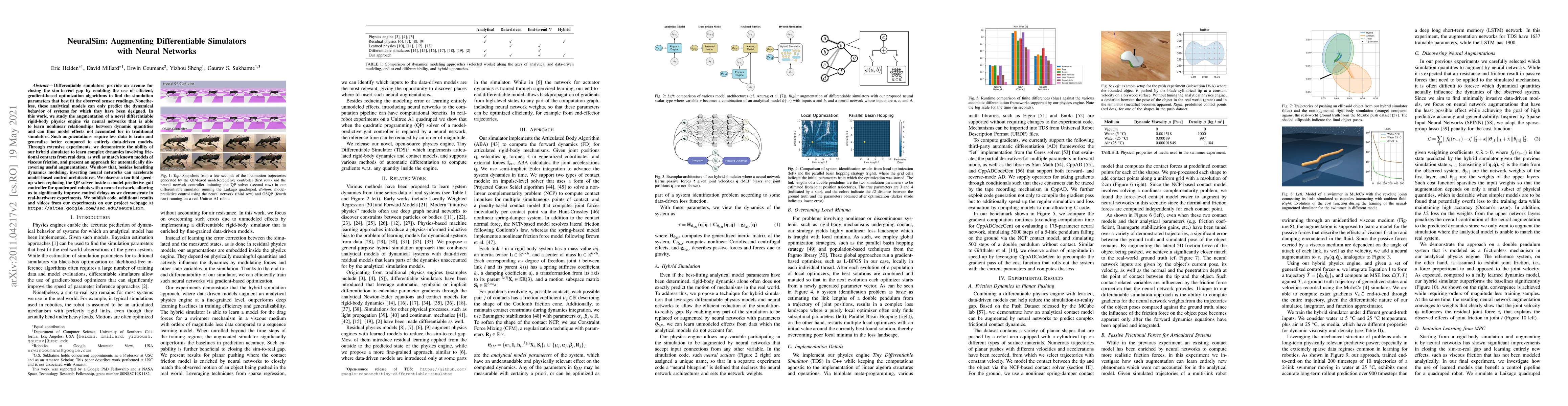 NeuralSim combines differentiable simulators with neural networks to enhance rigid-body physics engines, enabling them to learn complex nonlinear dynamics and improve model-based control. This hybrid approach accelerates model-based control, as demonstrated by a ten-fold speed-up in a quadruped robot's model-predictive gait controller.