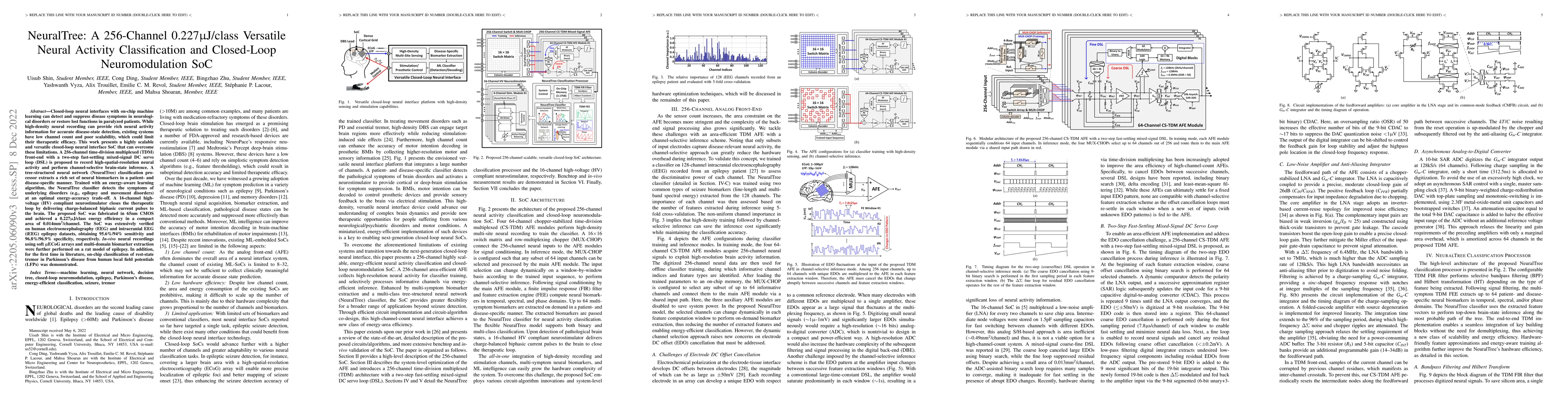 This paper presents a highly scalable 256-channel neural interface SoC for closed-loop neuromodulation, featuring a time-division multiplexed front-end and a NeuralTree classifier for disease-specific neural activity detection. The SoC achieves 0.227-$\mu$J/class energy efficiency and demonstrated high sensitivity and specificity in detecting epilepsy and Parkinson's disease symptoms.