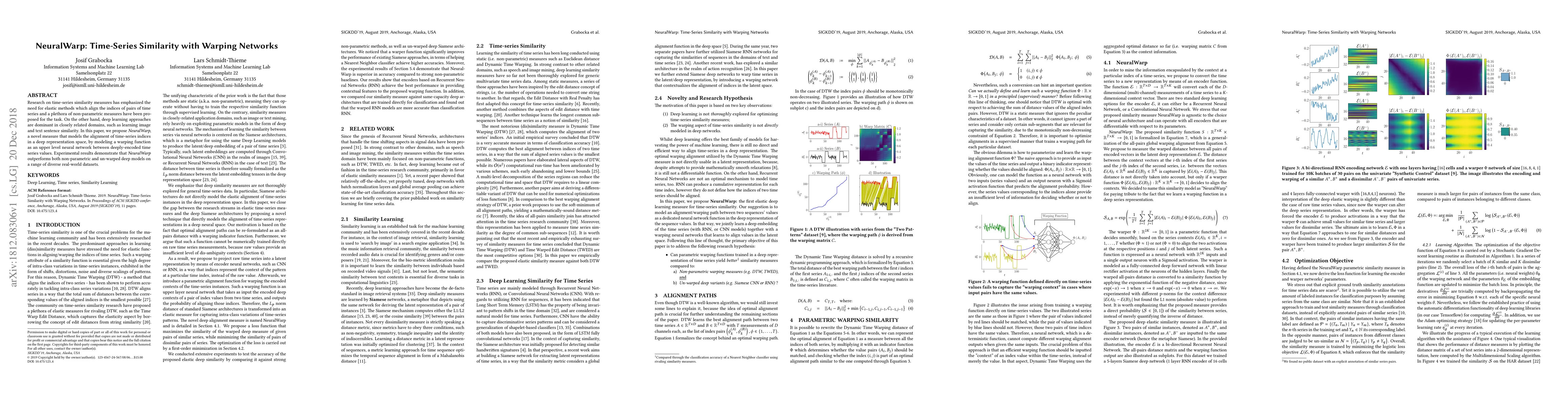 NeuralWarp introduces a novel deep learning approach for time-series similarity by using a warping function modeled as a neural network to align time-series indices in a deep representation space. Experimental results show that NeuralWarp outperforms both non-parametric and un-warped deep models across various real-life datasets.