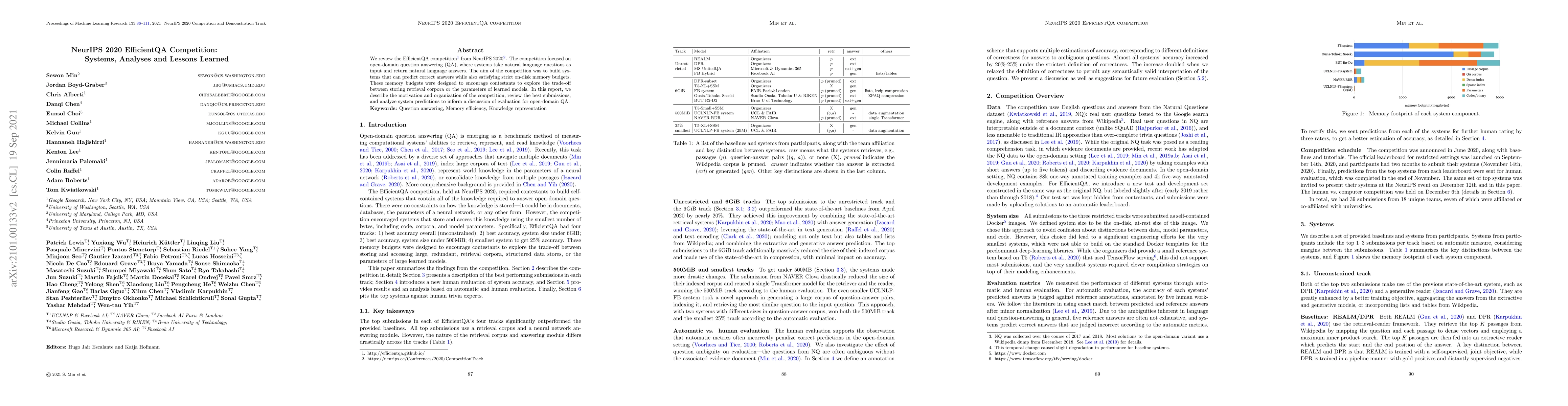 The NeurIPS 2020 EfficientQA Competition focused on open-domain question answering with strict on-disk memory budgets, encouraging contestants to explore trade-offs between retrieval corpora and model parameters.