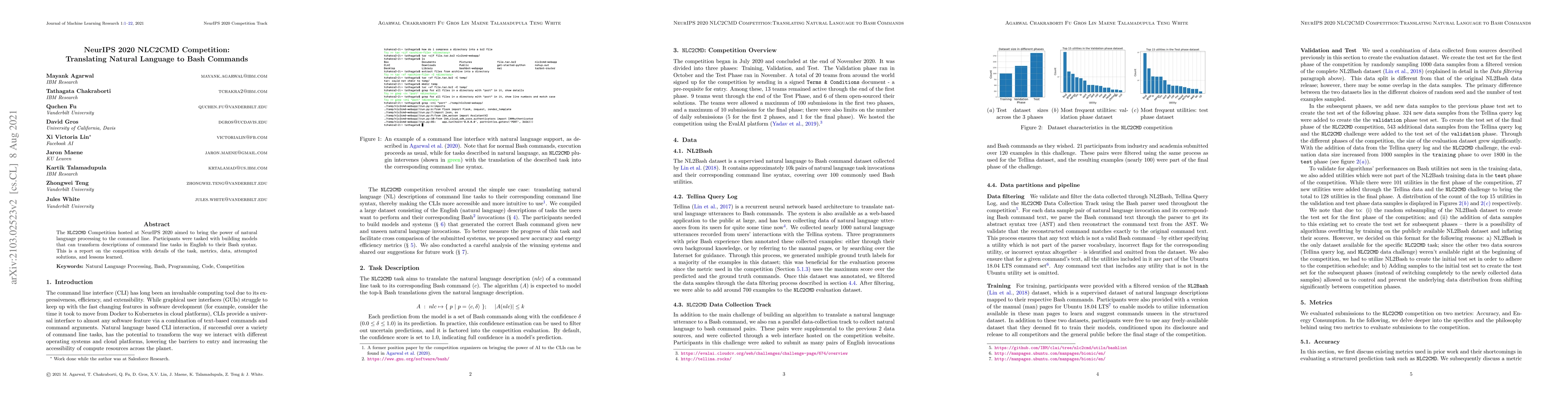 The NLC2CMD Competition hosted at NeurIPS 2020 aimed to bring the power of natural language processing to the command line. Participants were tasked with building models that can transform descriptions of command line tasks in English to their Bash syntax. This is a report on the competition with details of the task, metrics, data, attempted solutions, and lessons learned.