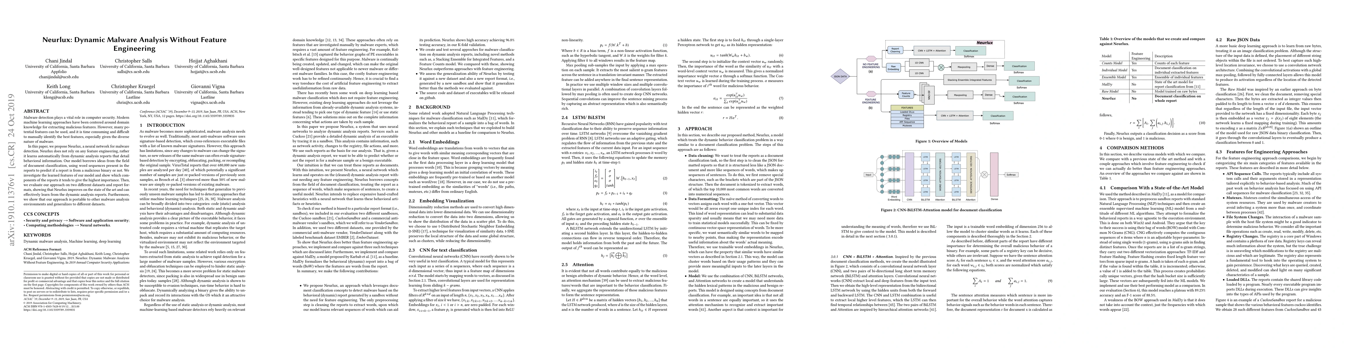 Neurlux is a neural network for malware detection that automatically learns from dynamic analysis reports without feature engineering. It uses word sequences in the reports to classify malicious binaries, demonstrating improved performance over existing methods and generalizability across different datasets.