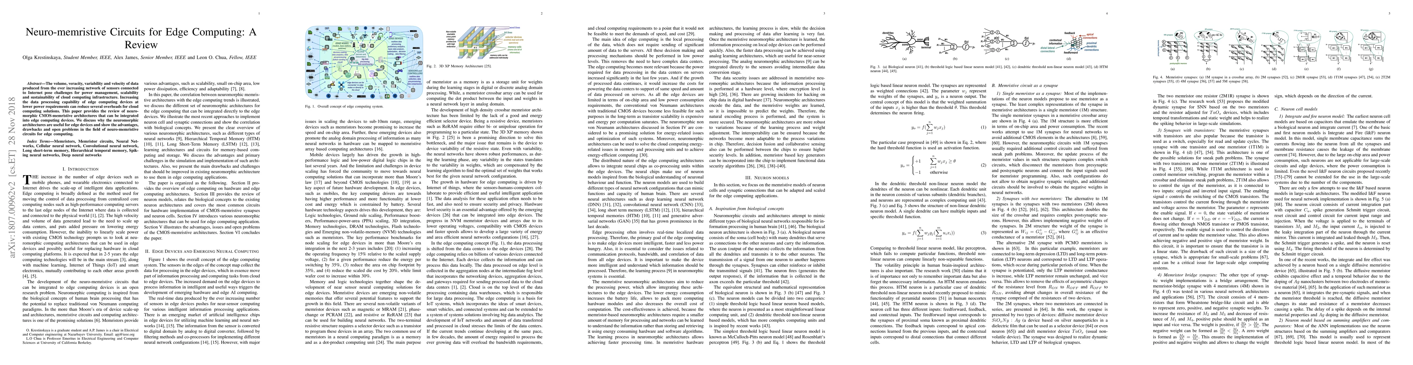 The volume, veracity, variability, and velocity of data produced from the ever-increasing network of sensors connected to Internet pose challenges for power management, scalability, and sustainability of cloud computing infrastructure. Increasing the data processing capability of edge computing devices at lower power requirements can reduce several overheads for cloud computing solutions. This paper provides the review of neuromorphic CMOS-memristive architectures that can be integrated into edge computing devices. We discuss why the neuromorphic architectures are useful for edge devices and show the advantages, drawbacks and open problems in the field of neuro-memristive circuits for edge computing.