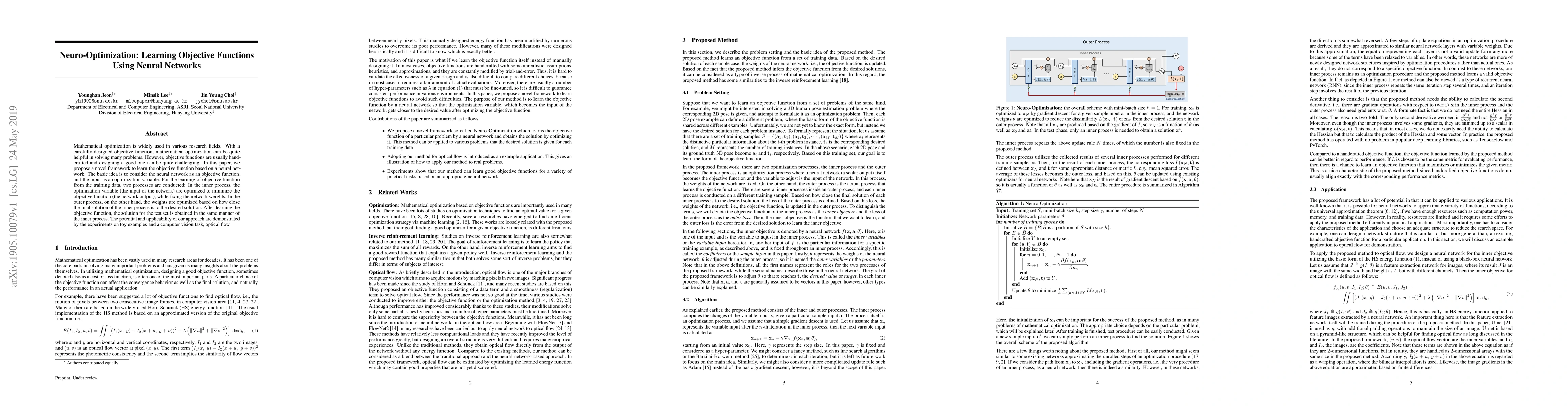 Mathematical optimization is widely used in various research fields. With a carefully-designed objective function, mathematical optimization can be quite helpful in solving many problems. However, objective functions are usually hand-crafted and designing a good one can be quite challenging. In this paper, we propose a novel framework to learn the objective function based on a neural net-work. The basic idea is to consider the neural network as an objective function, and the input as an optimization variable. For the learning of objective function from the training data, two processes are conducted: In the inner process, the optimization variable (the input of the network) are optimized to minimize the objective function (the network output), while fixing the network weights. In the outer process, on the other hand, the weights are optimized based on how close the final solution of the inner process is to the desired solution. After learning the objective function, the solution for the test set is obtained in the same manner of the inner process. The potential and applicability of our approach are demonstrated by the experiments on toy examples and a computer vision task, optical flow.