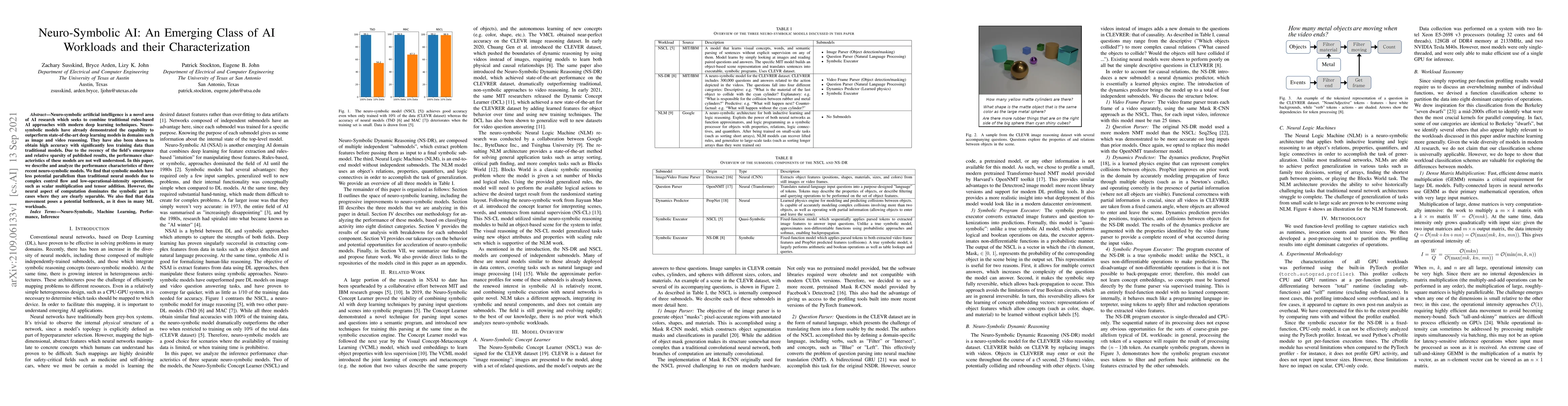 Neuro-symbolic artificial intelligence is a novel area of AI research which seeks to combine traditional rules-based AI approaches with modern deep learning techniques. Neuro-symbolic models have already demonstrated the capability to outperform state-of-the-art deep learning models in domains such as image and video reasoning. They have also been shown to obtain high accuracy with significantly less training data than traditional models. Due to the recency of the field's emergence and relative sparsity of published results, the performance characteristics of these models are not well understood. In this paper, we describe and analyze the performance characteristics of three recent neuro-symbolic models. We find that symbolic models have less potential parallelism than traditional neural models due to complex control flow and low-operational-intensity operations, such as scalar multiplication and tensor addition. However, the neural aspect of computation dominates the symbolic part in cases where they are clearly separable. We also find that data movement poses a potential bottleneck, as it does in many ML workloads.