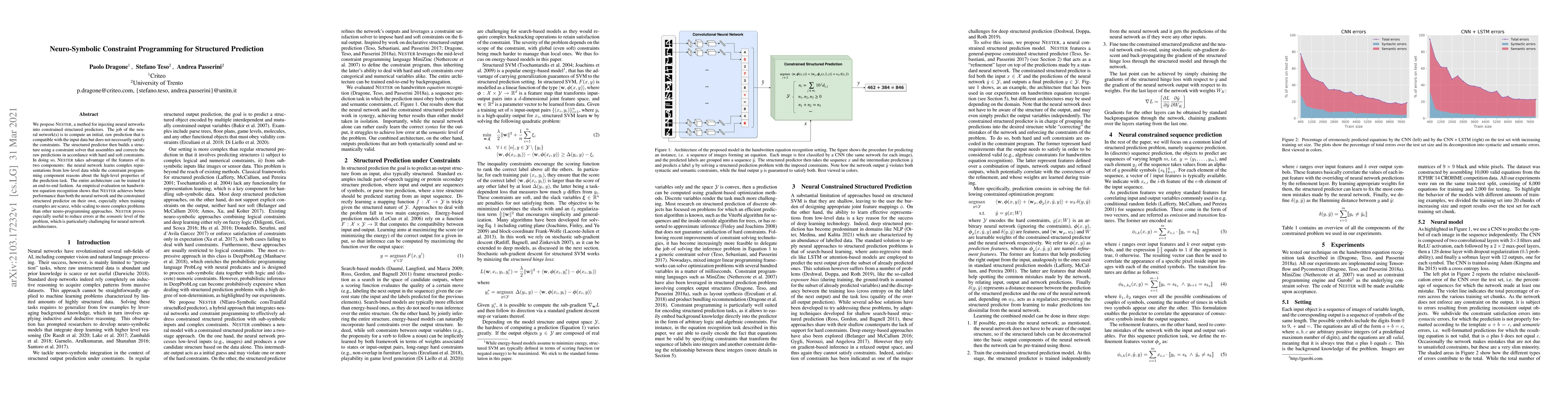 This paper introduces Nester, a neuro-symbolic method that combines neural networks with constraint programming for structured prediction, enhancing performance in tasks like handwritten equation recognition. It leverages neural networks for complex representation learning and constraint solvers for high-level reasoning, achieving better results than either component alone, especially with limited training data.